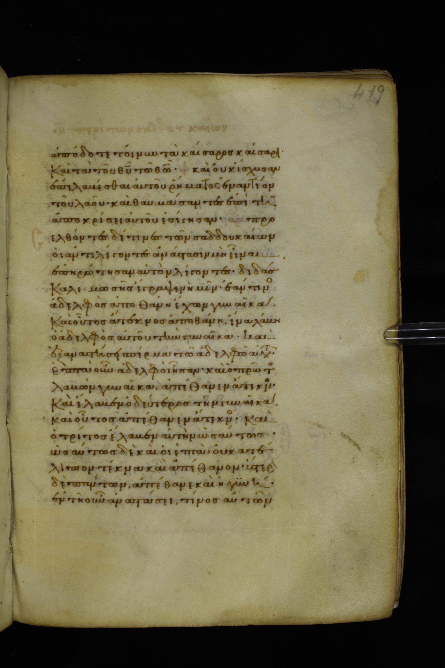 Fourteenth century minuscule of the Gospels on parchment; 282 leaves, 1 column, 22-23 lines per column. Images were taken at the National Library of Greece in Athens.