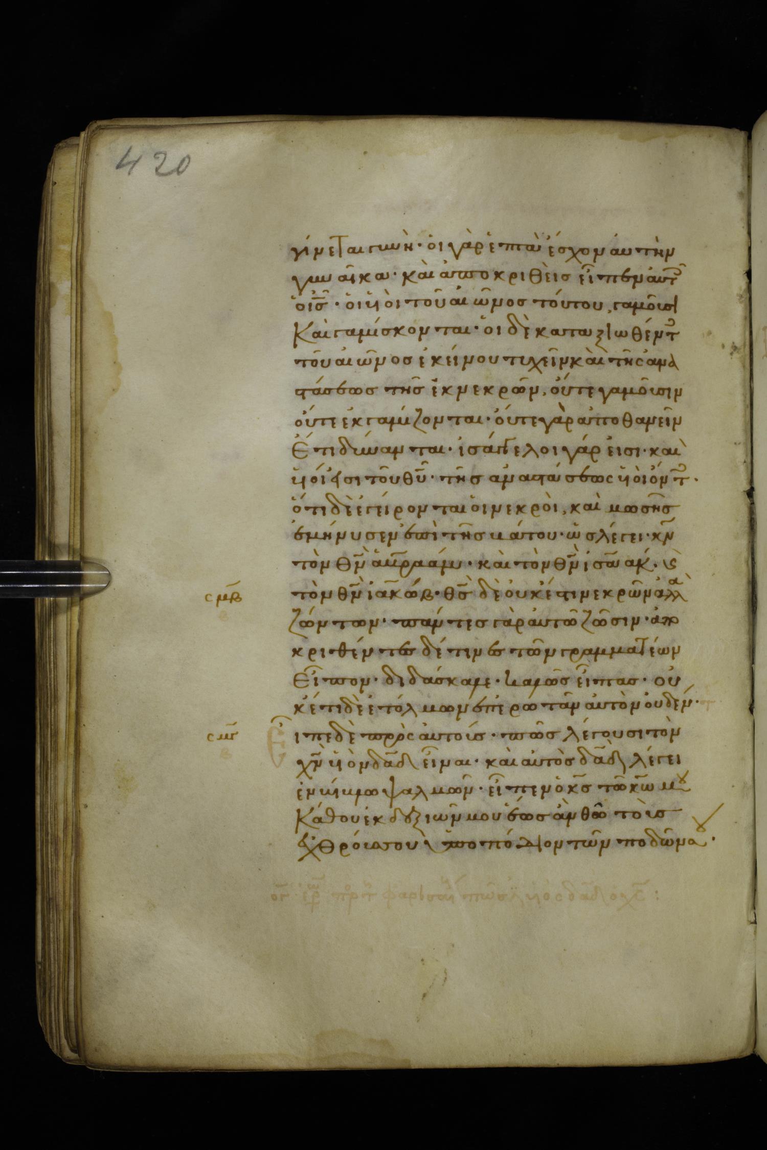 Fourteenth century minuscule of the Gospels on parchment; 282 leaves, 1 column, 22-23 lines per column. Images were taken at the National Library of Greece in Athens.