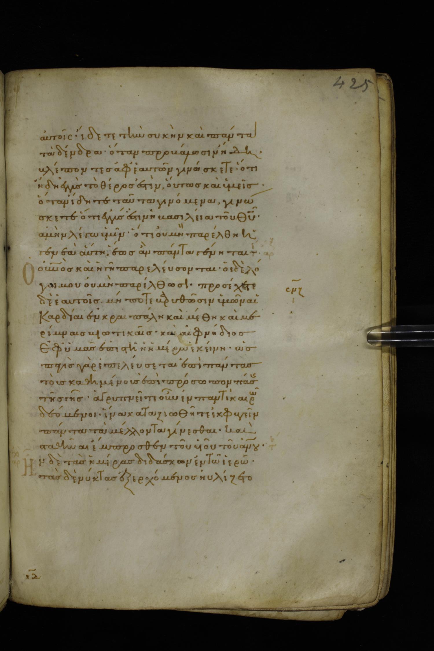 Fourteenth century minuscule of the Gospels on parchment; 282 leaves, 1 column, 22-23 lines per column. Images were taken at the National Library of Greece in Athens.