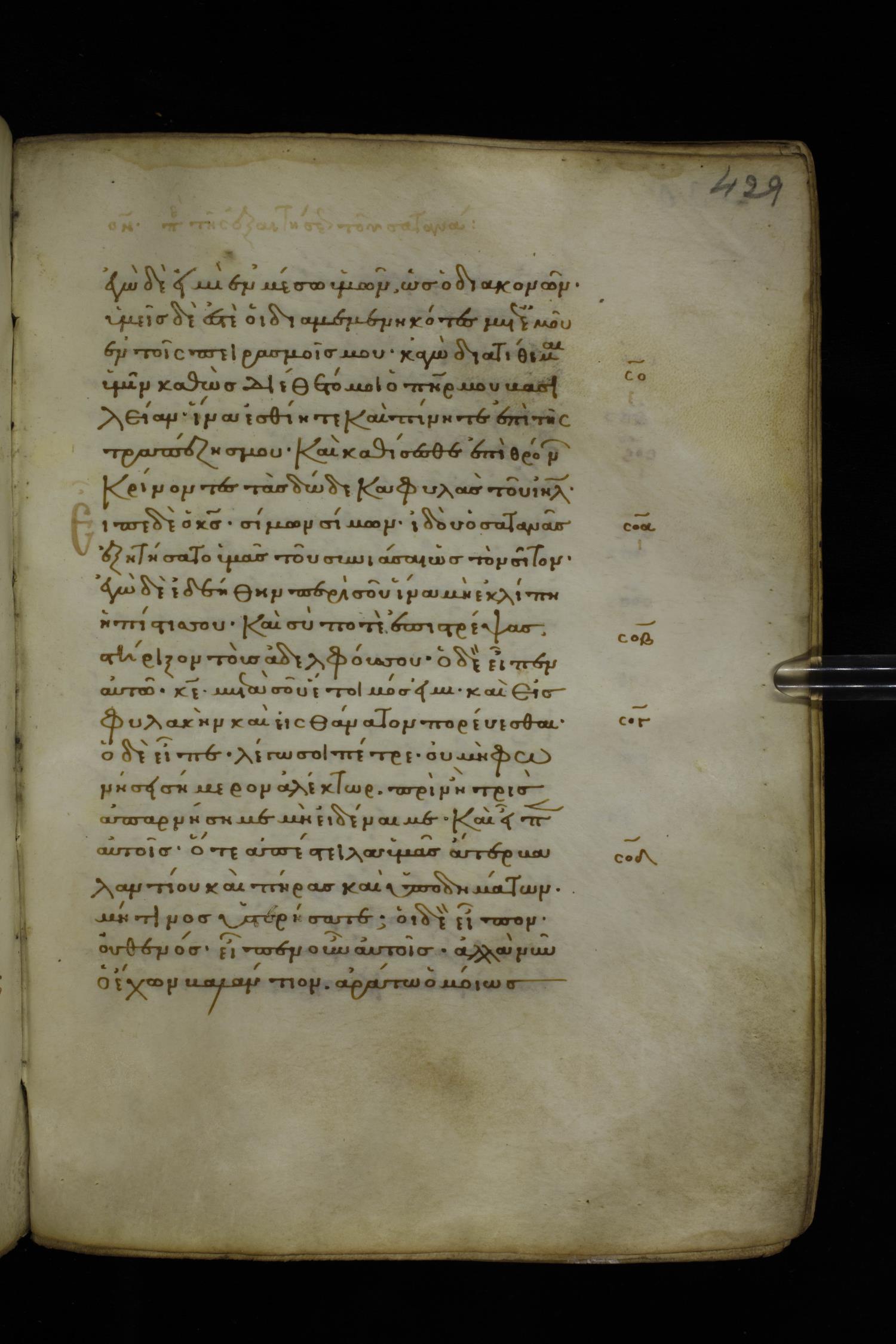 Fourteenth century minuscule of the Gospels on parchment; 282 leaves, 1 column, 22-23 lines per column. Images were taken at the National Library of Greece in Athens.