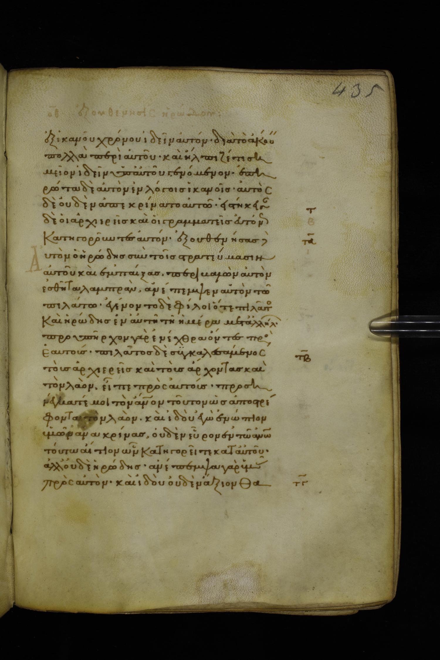 Fourteenth century minuscule of the Gospels on parchment; 282 leaves, 1 column, 22-23 lines per column. Images were taken at the National Library of Greece in Athens.