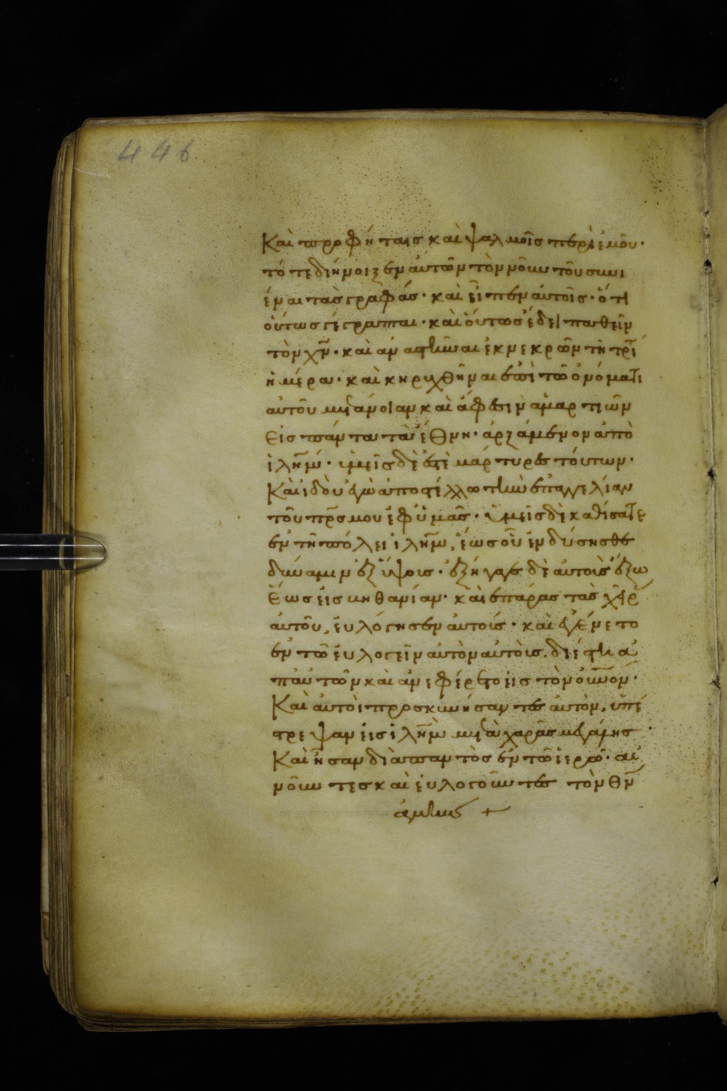 Fourteenth century minuscule of the Gospels on parchment; 282 leaves, 1 column, 22-23 lines per column. Images were taken at the National Library of Greece in Athens.