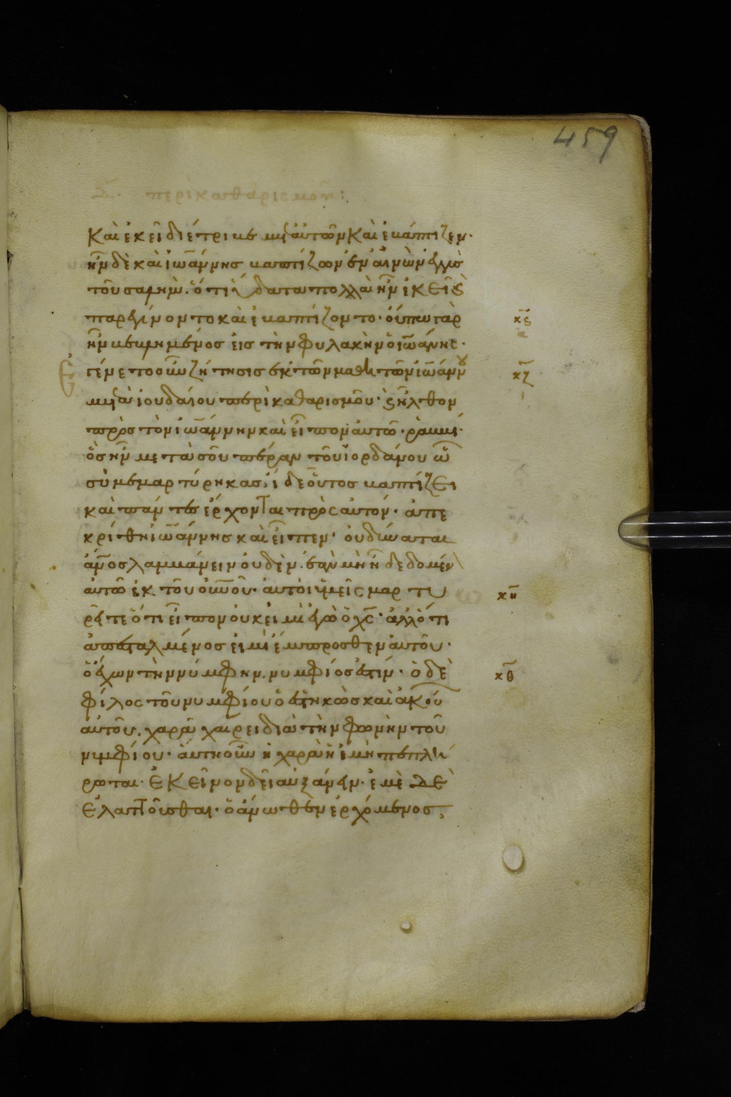 Fourteenth century minuscule of the Gospels on parchment; 282 leaves, 1 column, 22-23 lines per column. Images were taken at the National Library of Greece in Athens.
