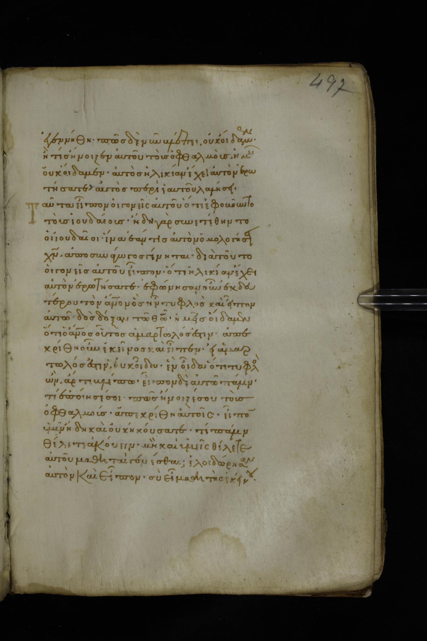 Fourteenth century minuscule of the Gospels on parchment; 282 leaves, 1 column, 22-23 lines per column. Images were taken at the National Library of Greece in Athens.