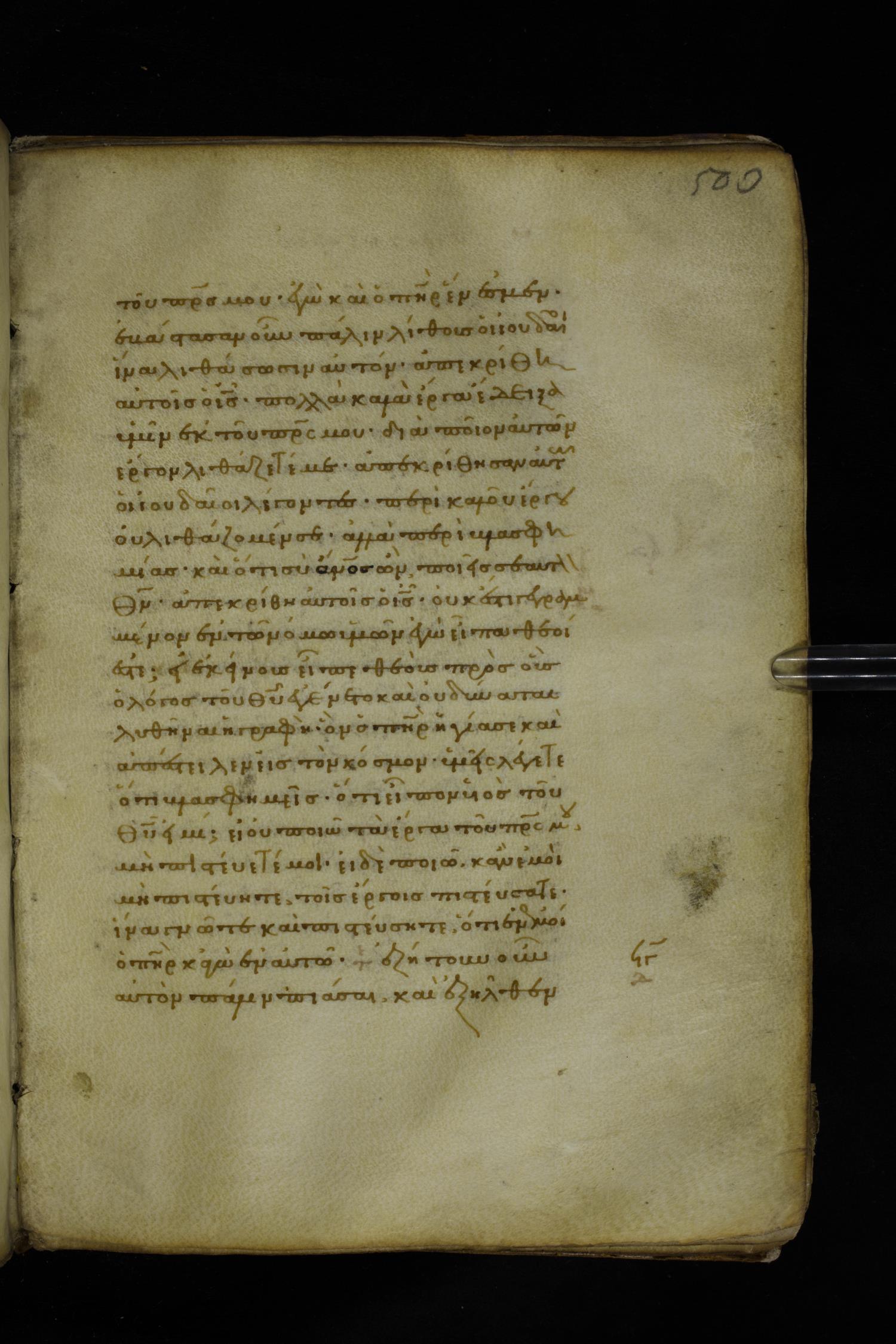 Fourteenth century minuscule of the Gospels on parchment; 282 leaves, 1 column, 22-23 lines per column. Images were taken at the National Library of Greece in Athens.