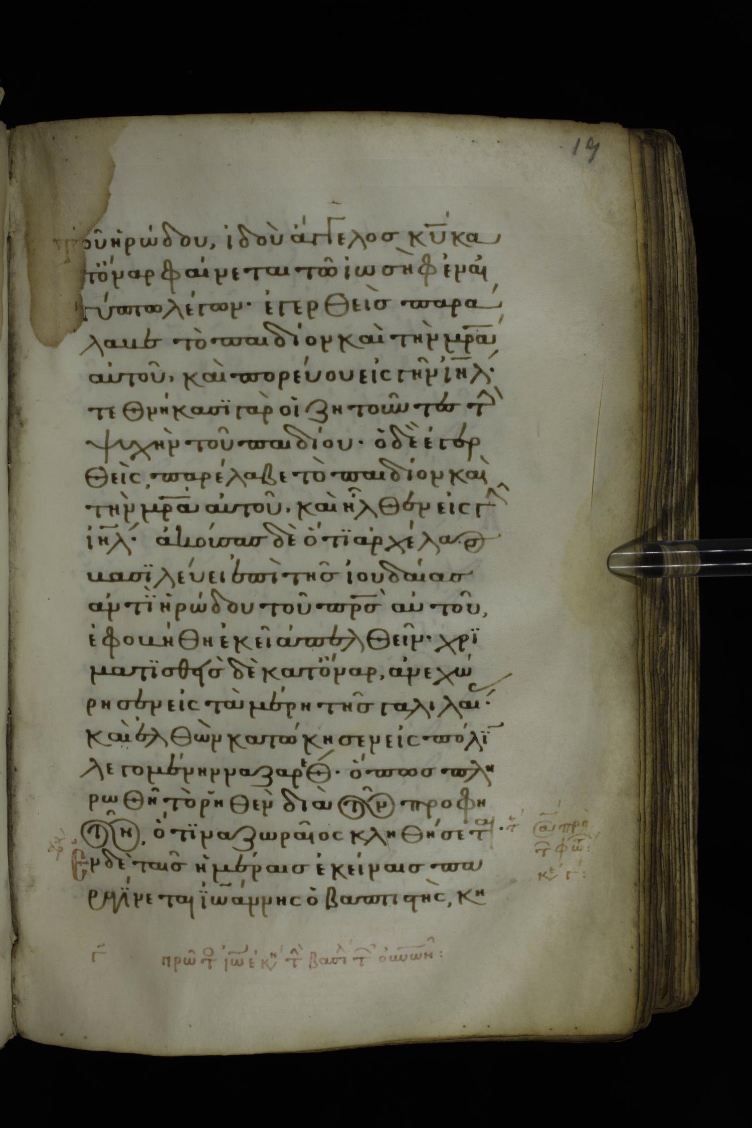 Fourteenth century minuscule of the Gospels on parchment; 332 leaves, 1 column, 21 lines per column. Images were taken at the National Library of Greece in Athens.
