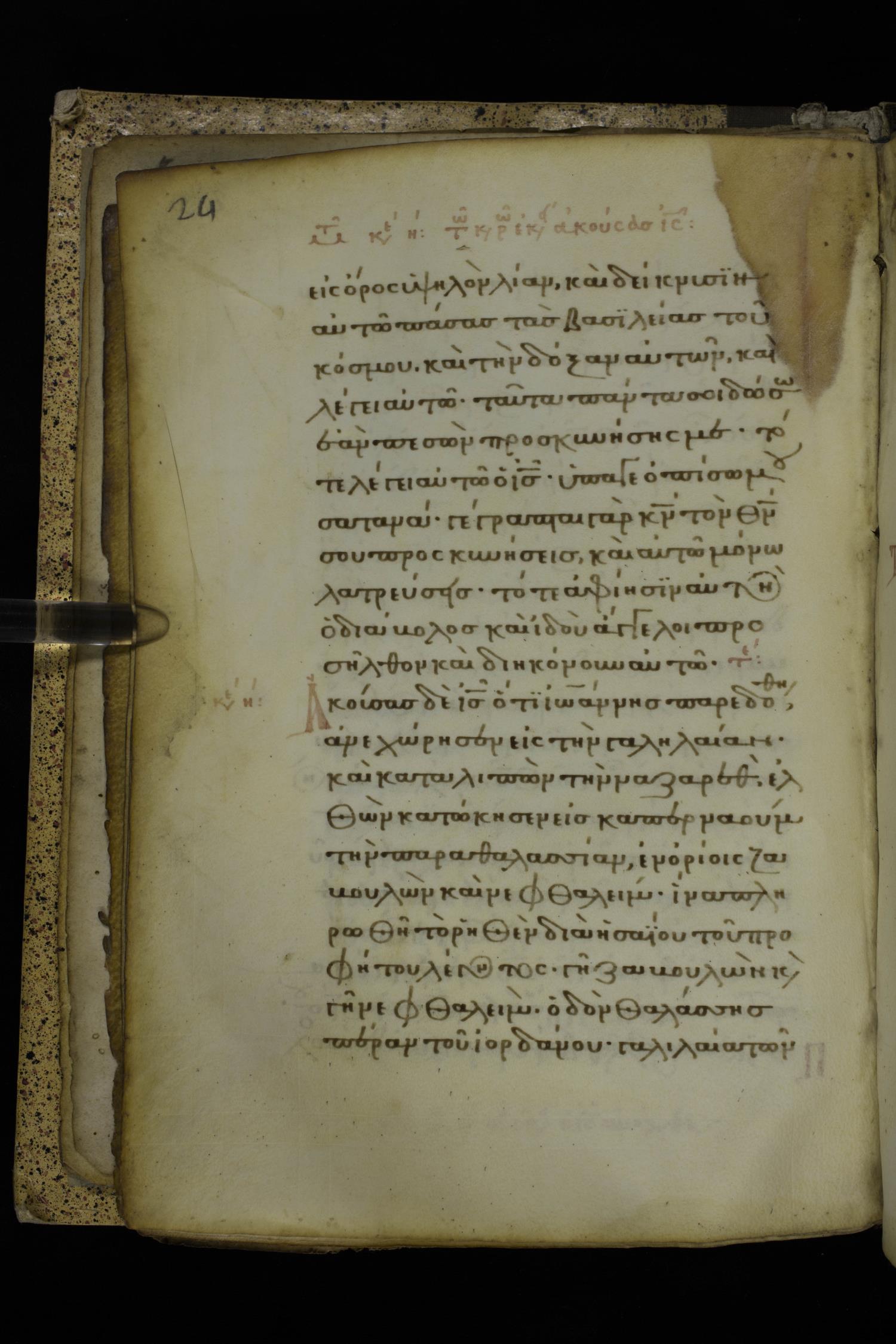 Fourteenth century minuscule of the Gospels on parchment; 332 leaves, 1 column, 21 lines per column. Images were taken at the National Library of Greece in Athens.