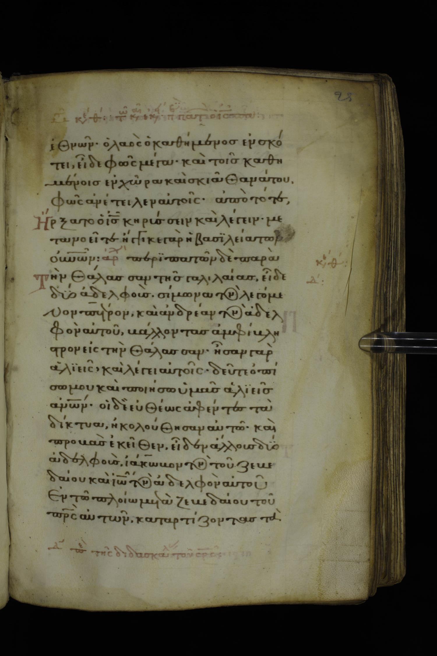 Fourteenth century minuscule of the Gospels on parchment; 332 leaves, 1 column, 21 lines per column. Images were taken at the National Library of Greece in Athens.