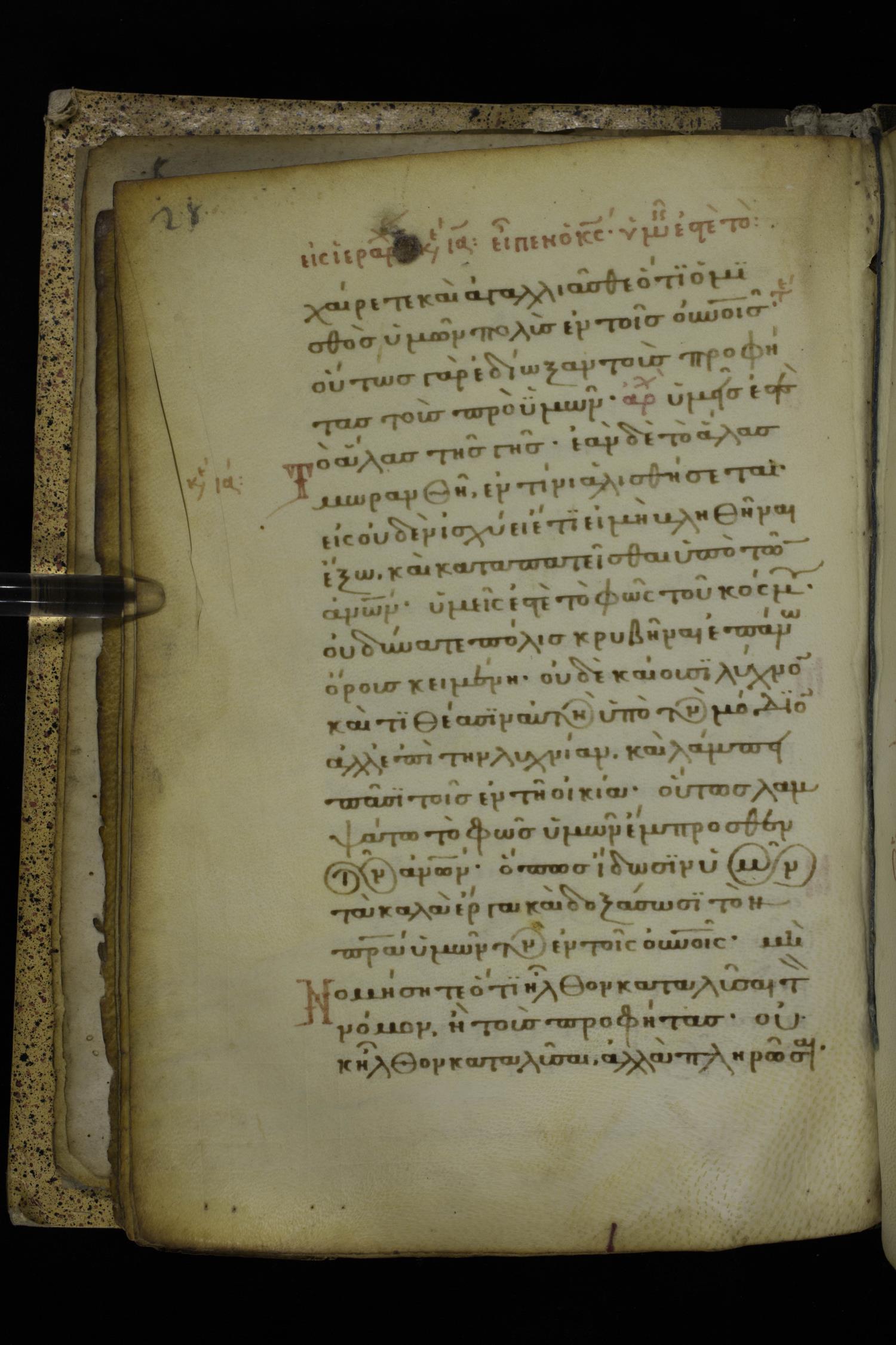 Fourteenth century minuscule of the Gospels on parchment; 332 leaves, 1 column, 21 lines per column. Images were taken at the National Library of Greece in Athens.