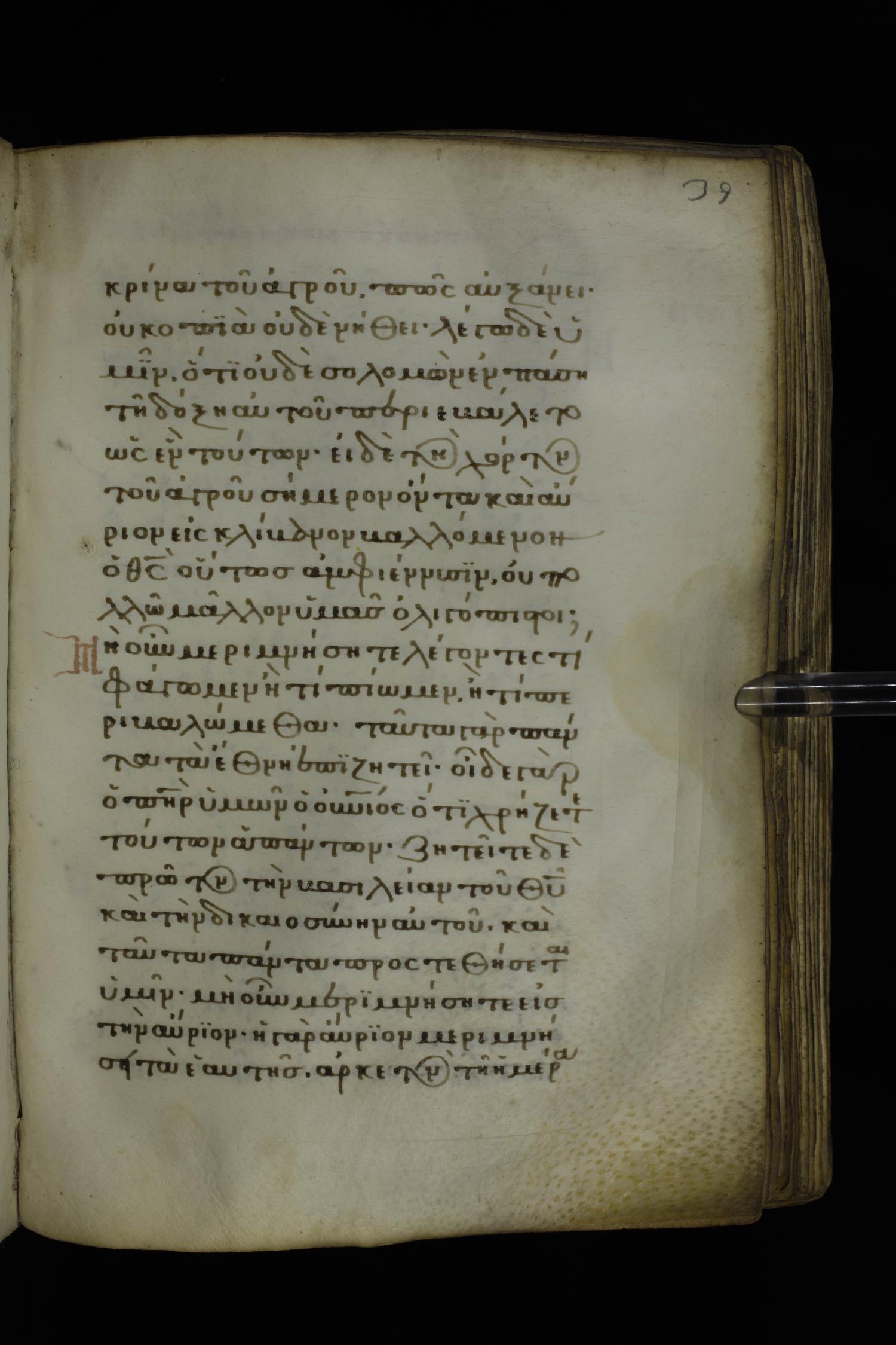 Fourteenth century minuscule of the Gospels on parchment; 332 leaves, 1 column, 21 lines per column. Images were taken at the National Library of Greece in Athens.