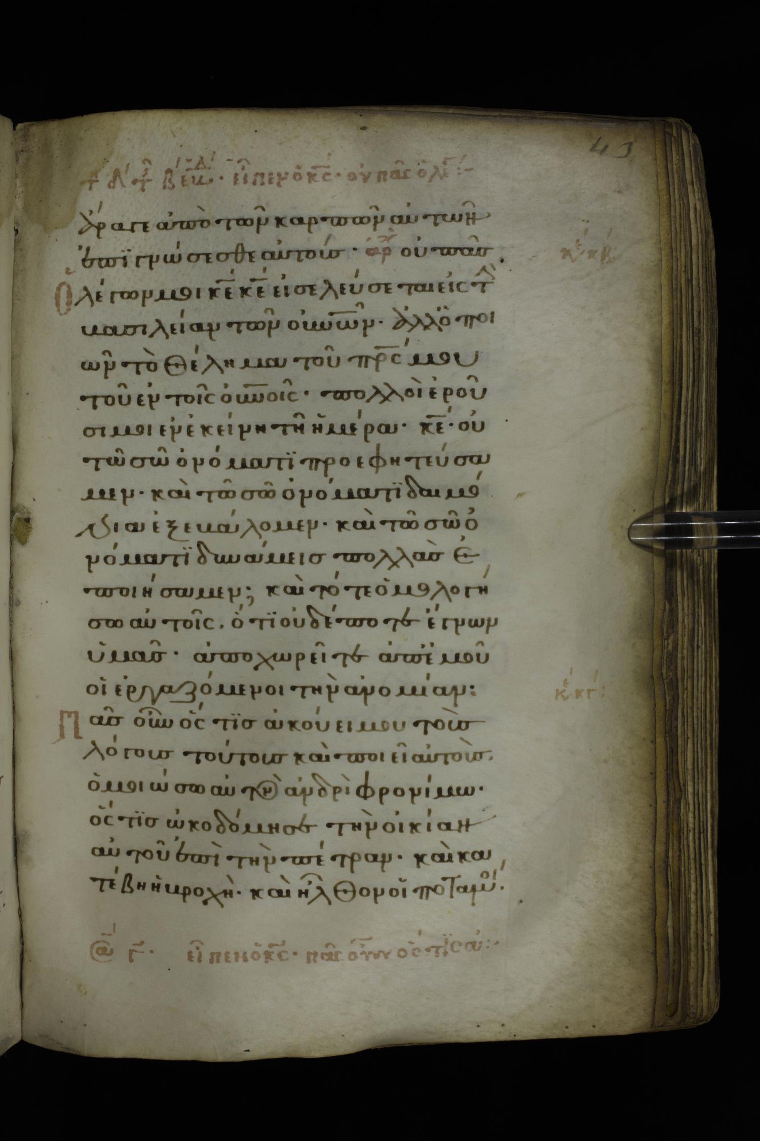 Fourteenth century minuscule of the Gospels on parchment; 332 leaves, 1 column, 21 lines per column. Images were taken at the National Library of Greece in Athens.