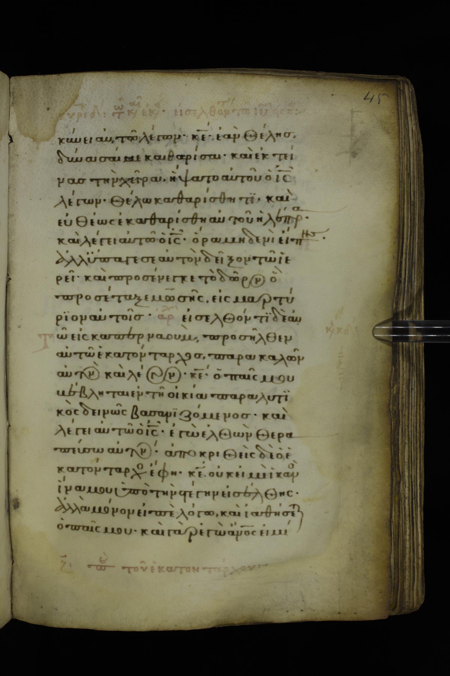 καὶ ἐκτείνας τὴν χεῖρα ἥψατο αὐτοῦ λέγων Θέλω, καθαρίσθητι· καὶ εὐθέως ἐκαθερίσθη / ἐκαθαρίσθη αὐτοῦ ἡ λέπρα.
