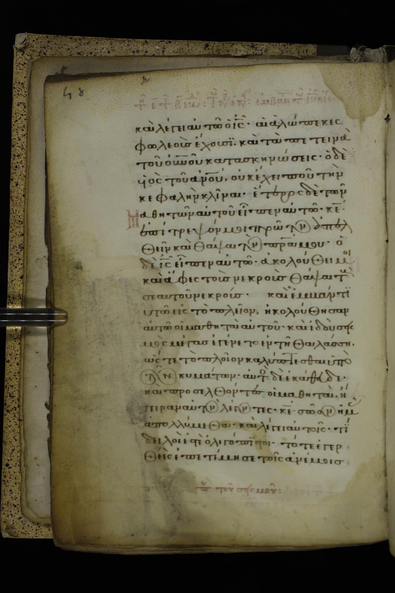 Fourteenth century minuscule of the Gospels on parchment; 332 leaves, 1 column, 21 lines per column. Images were taken at the National Library of Greece in Athens.