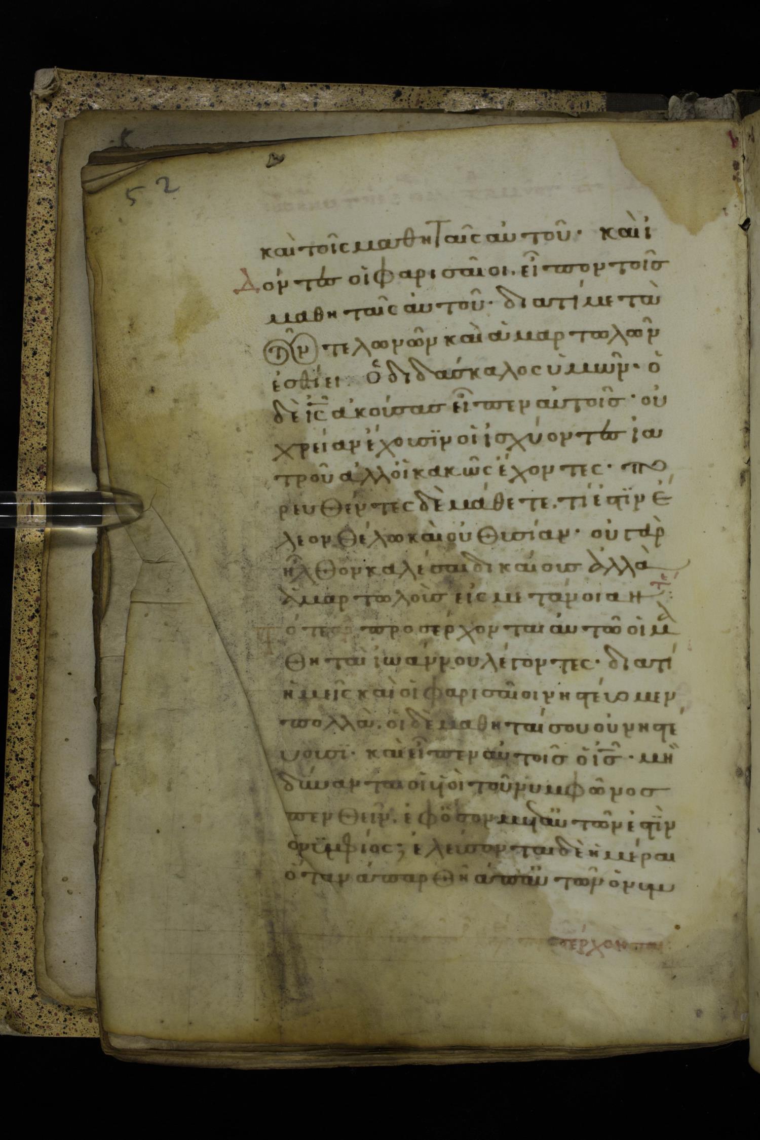 Fourteenth century minuscule of the Gospels on parchment; 332 leaves, 1 column, 21 lines per column. Images were taken at the National Library of Greece in Athens.