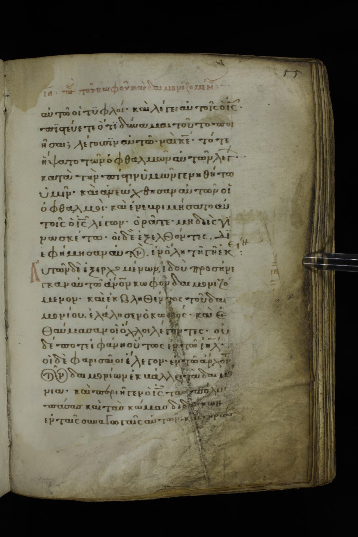 Fourteenth century minuscule of the Gospels on parchment; 332 leaves, 1 column, 21 lines per column. Images were taken at the National Library of Greece in Athens.