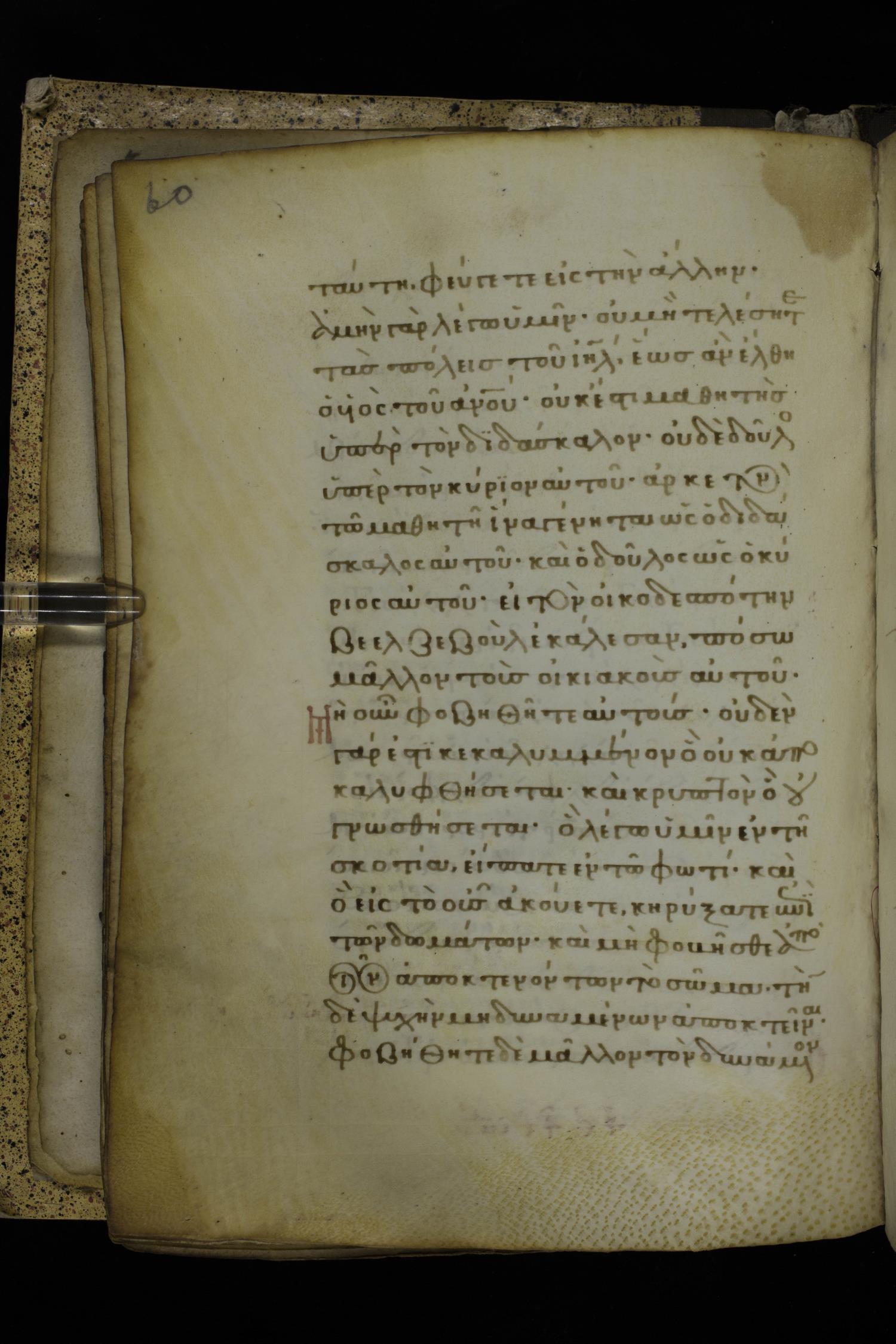 Fourteenth century minuscule of the Gospels on parchment; 332 leaves, 1 column, 21 lines per column. Images were taken at the National Library of Greece in Athens.