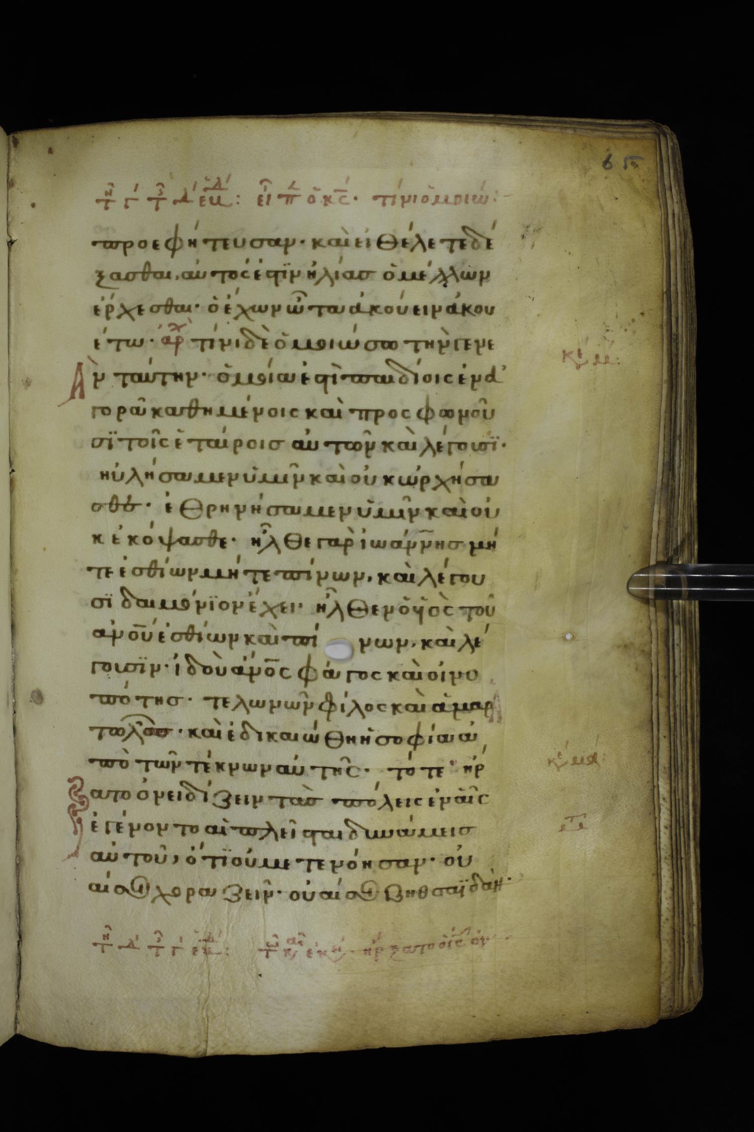 Fourteenth century minuscule of the Gospels on parchment; 332 leaves, 1 column, 21 lines per column. Images were taken at the National Library of Greece in Athens.