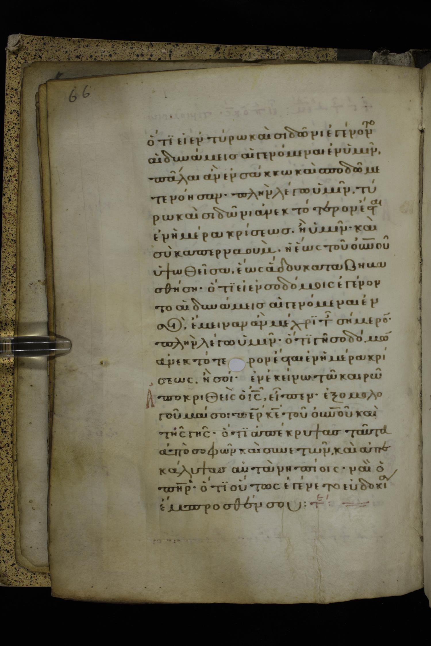 Fourteenth century minuscule of the Gospels on parchment; 332 leaves, 1 column, 21 lines per column. Images were taken at the National Library of Greece in Athens.