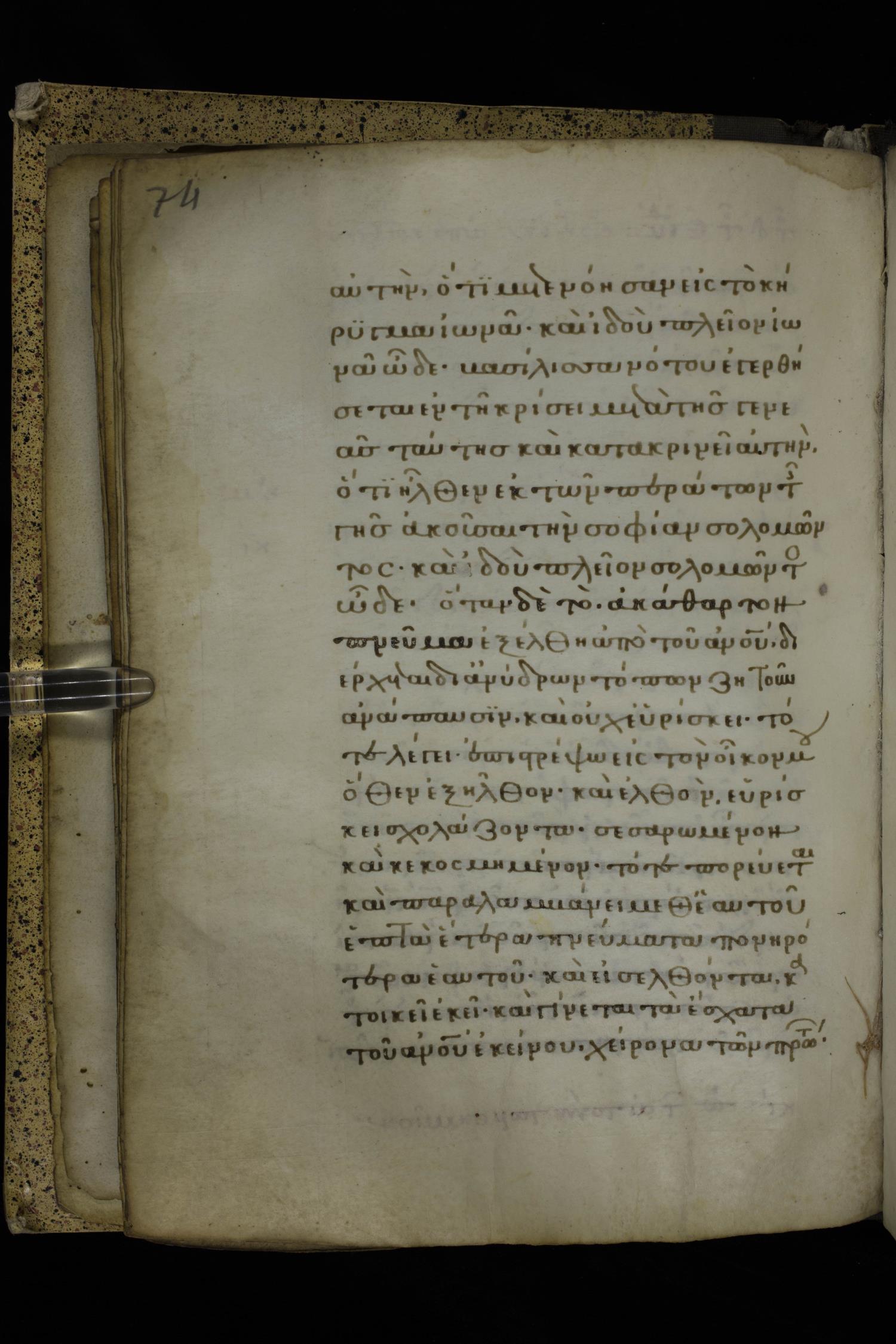 Fourteenth century minuscule of the Gospels on parchment; 332 leaves, 1 column, 21 lines per column. Images were taken at the National Library of Greece in Athens.