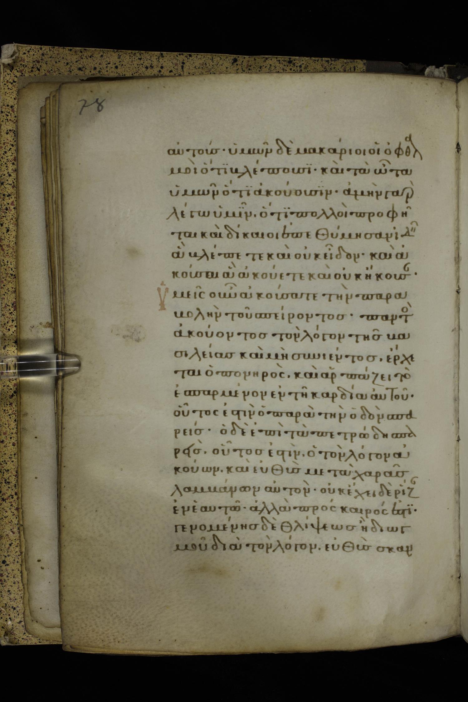 Fourteenth century minuscule of the Gospels on parchment; 332 leaves, 1 column, 21 lines per column. Images were taken at the National Library of Greece in Athens.