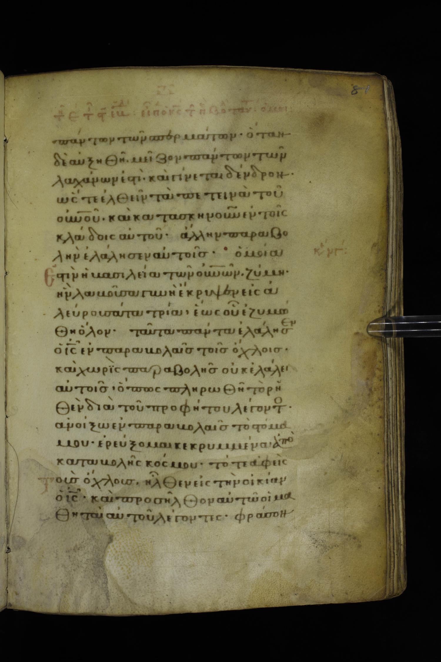 Fourteenth century minuscule of the Gospels on parchment; 332 leaves, 1 column, 21 lines per column. Images were taken at the National Library of Greece in Athens.