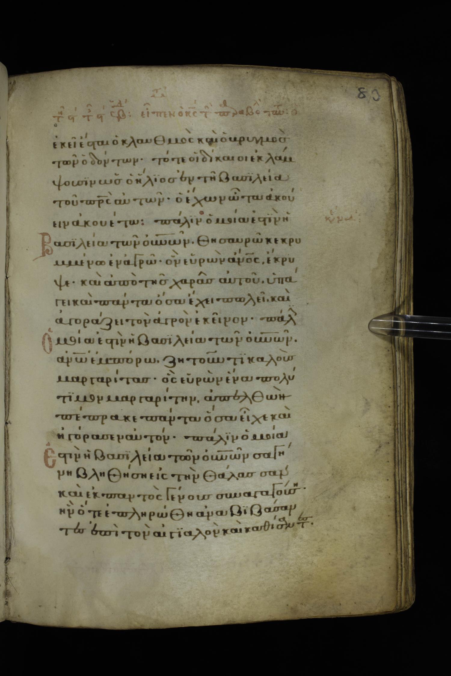 Fourteenth century minuscule of the Gospels on parchment; 332 leaves, 1 column, 21 lines per column. Images were taken at the National Library of Greece in Athens.