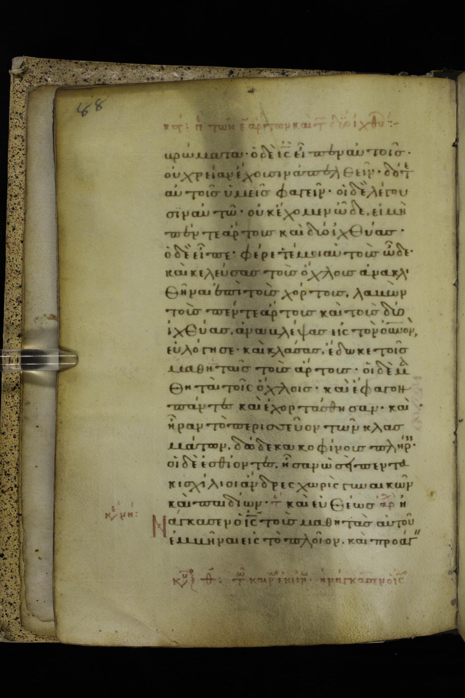 Fourteenth century minuscule of the Gospels on parchment; 332 leaves, 1 column, 21 lines per column. Images were taken at the National Library of Greece in Athens.