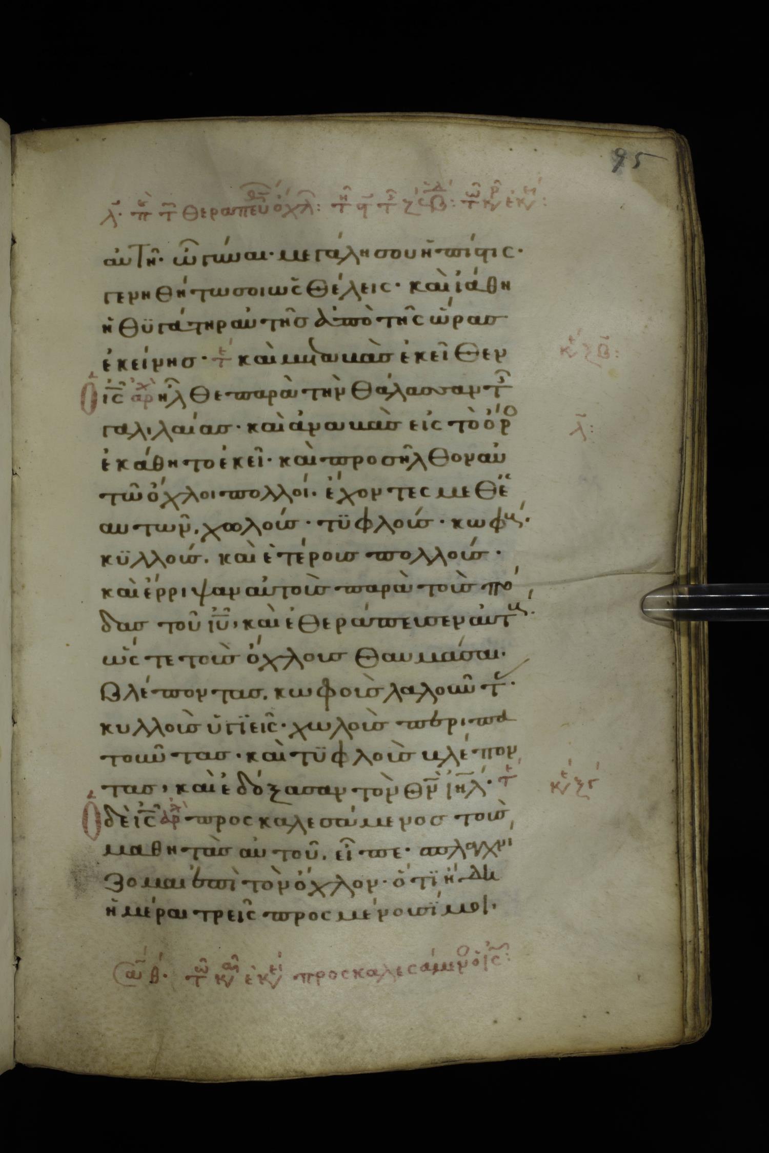 Fourteenth century minuscule of the Gospels on parchment; 332 leaves, 1 column, 21 lines per column. Images were taken at the National Library of Greece in Athens.