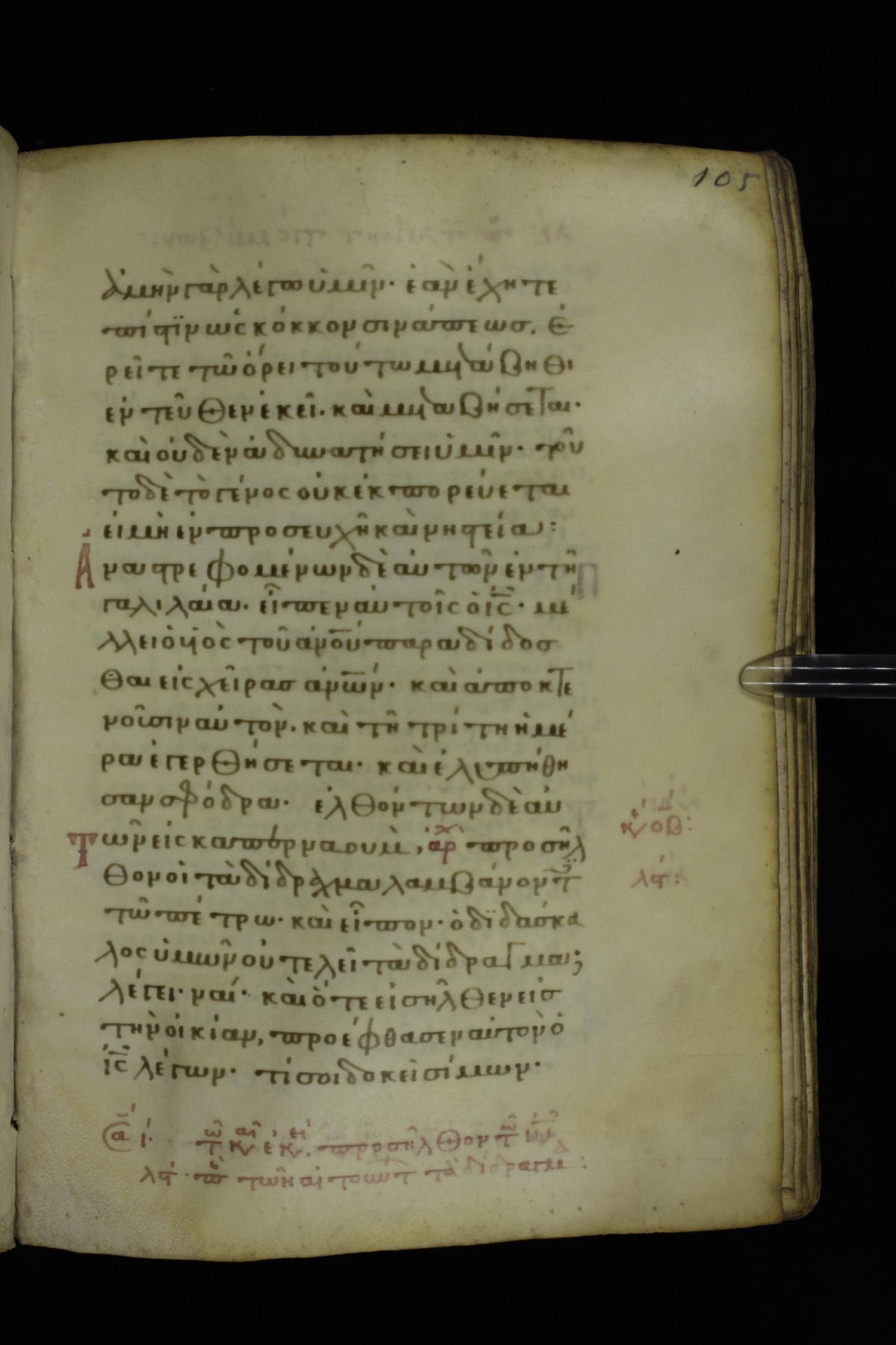 Fourteenth century minuscule of the Gospels on parchment; 332 leaves, 1 column, 21 lines per column. Images were taken at the National Library of Greece in Athens.