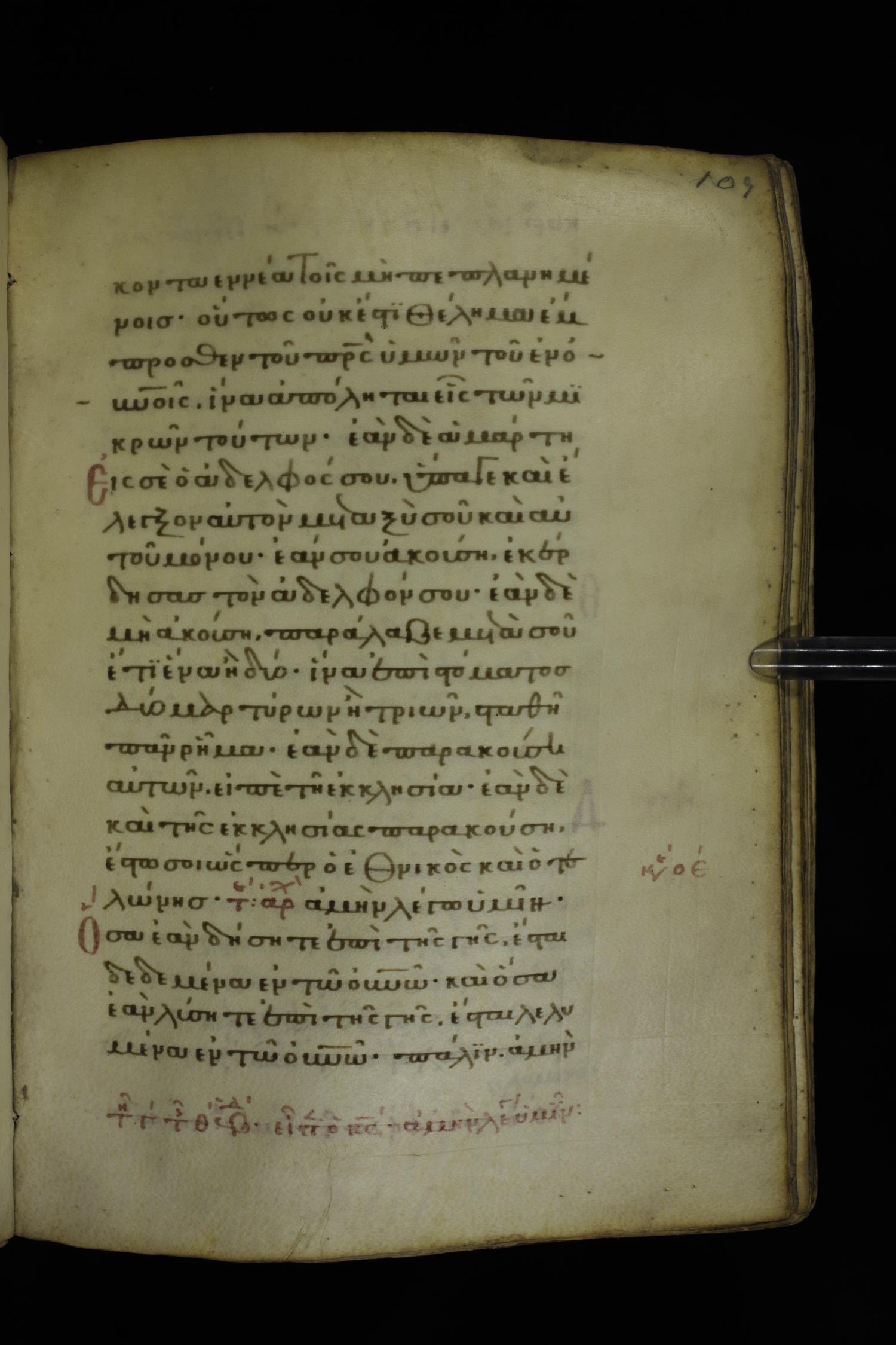 Fourteenth century minuscule of the Gospels on parchment; 332 leaves, 1 column, 21 lines per column. Images were taken at the National Library of Greece in Athens.