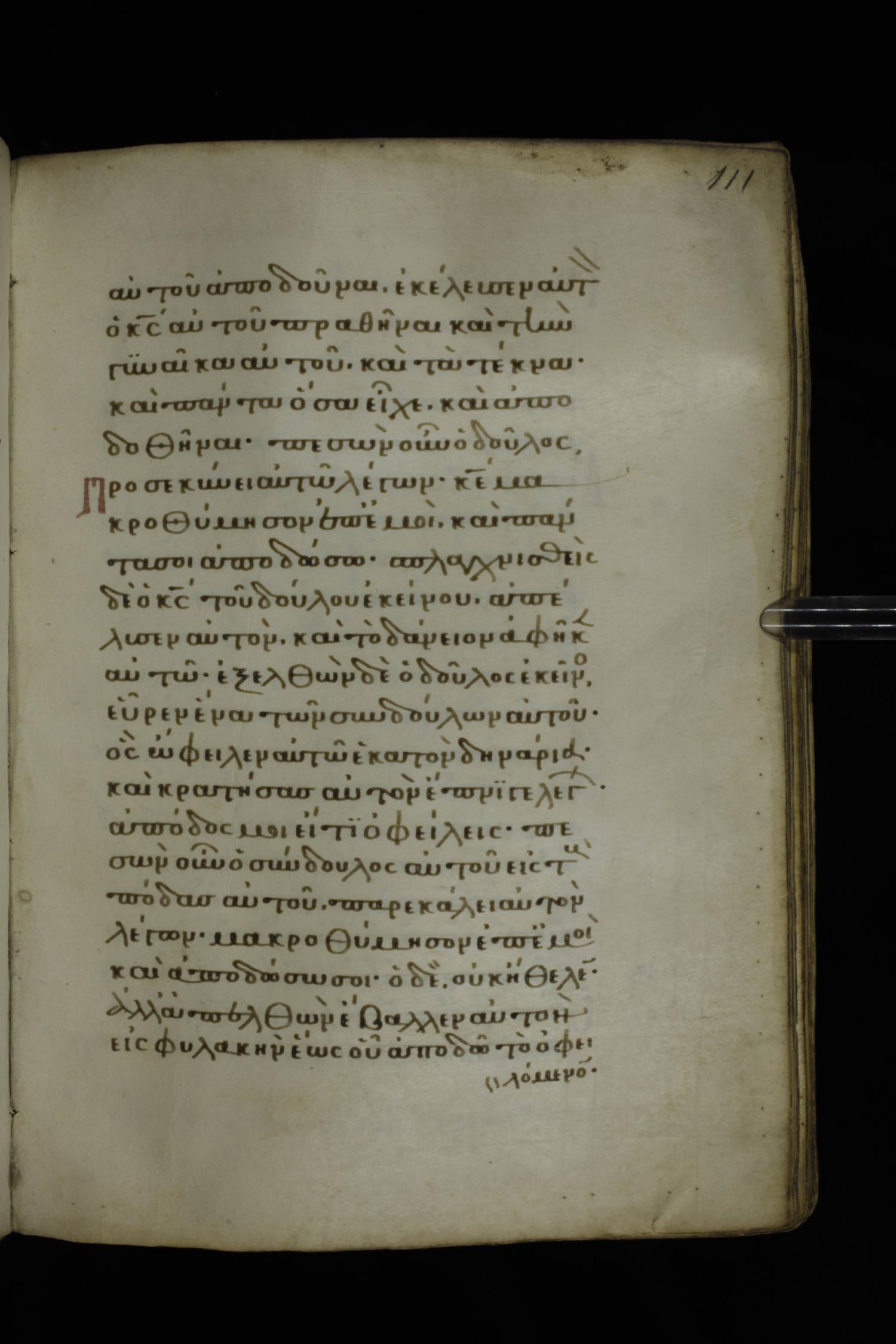 Fourteenth century minuscule of the Gospels on parchment; 332 leaves, 1 column, 21 lines per column. Images were taken at the National Library of Greece in Athens.