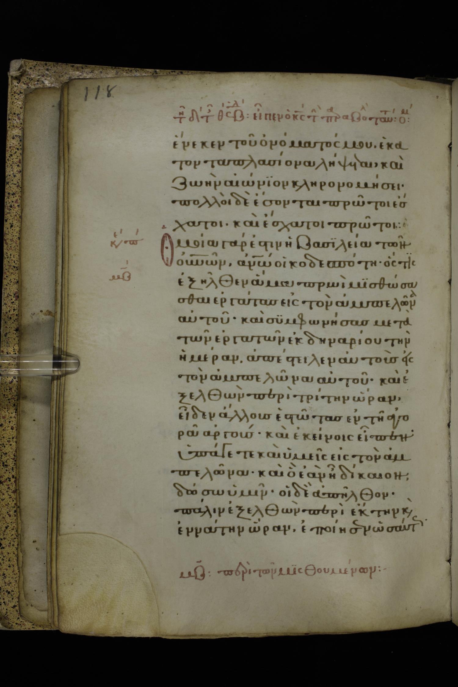 Fourteenth century minuscule of the Gospels on parchment; 332 leaves, 1 column, 21 lines per column. Images were taken at the National Library of Greece in Athens.
