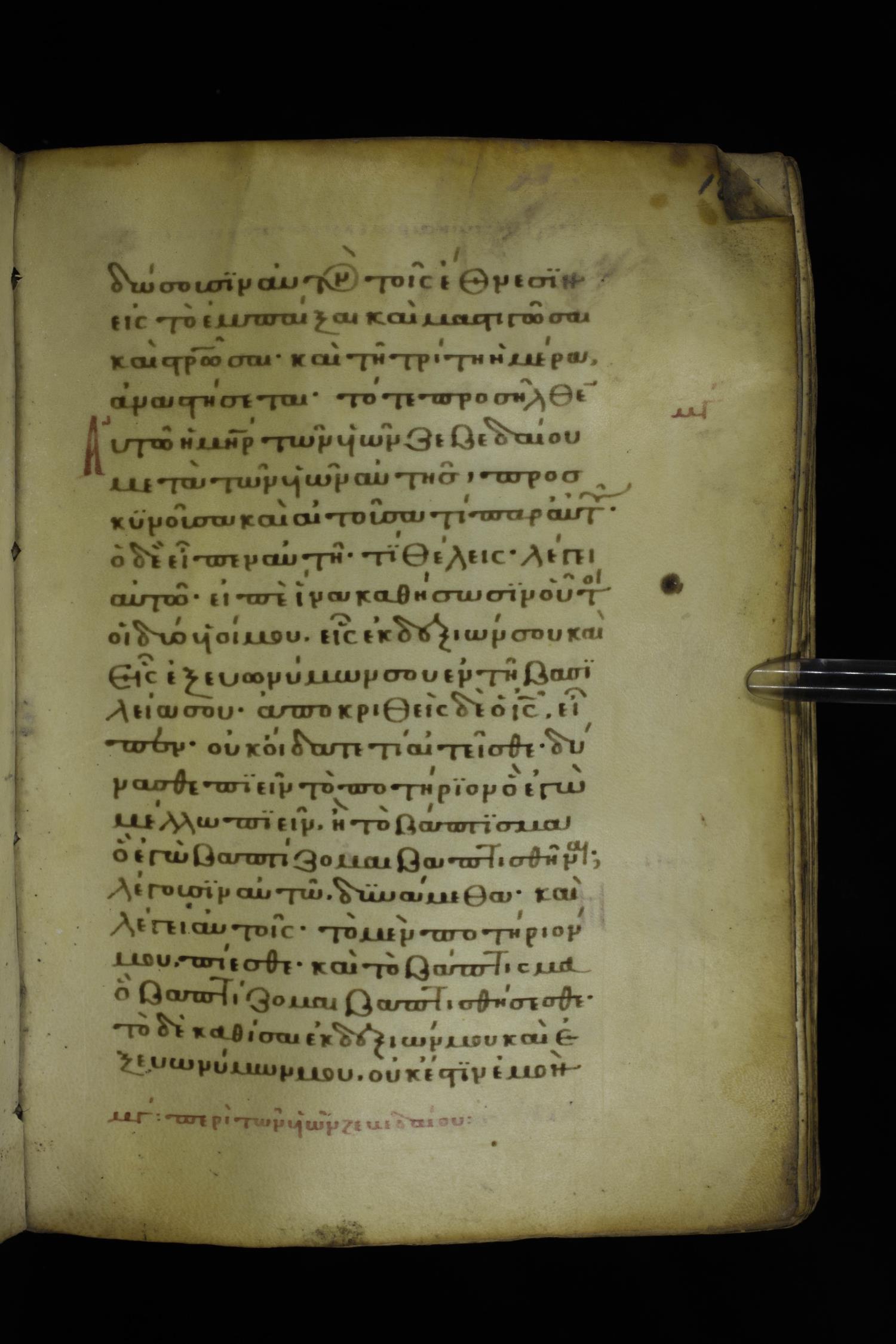 Fourteenth century minuscule of the Gospels on parchment; 332 leaves, 1 column, 21 lines per column. Images were taken at the National Library of Greece in Athens.