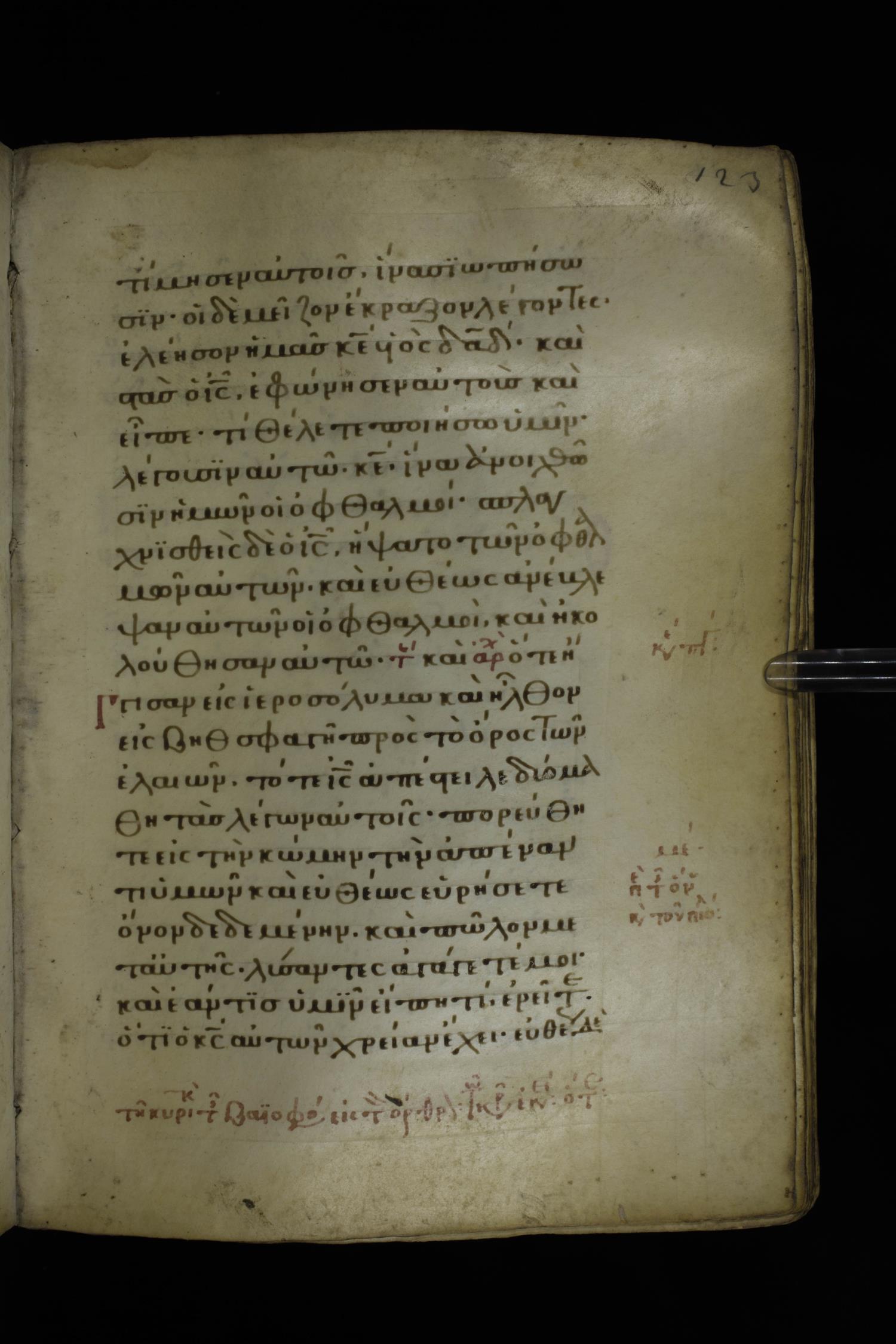 Fourteenth century minuscule of the Gospels on parchment; 332 leaves, 1 column, 21 lines per column. Images were taken at the National Library of Greece in Athens.
