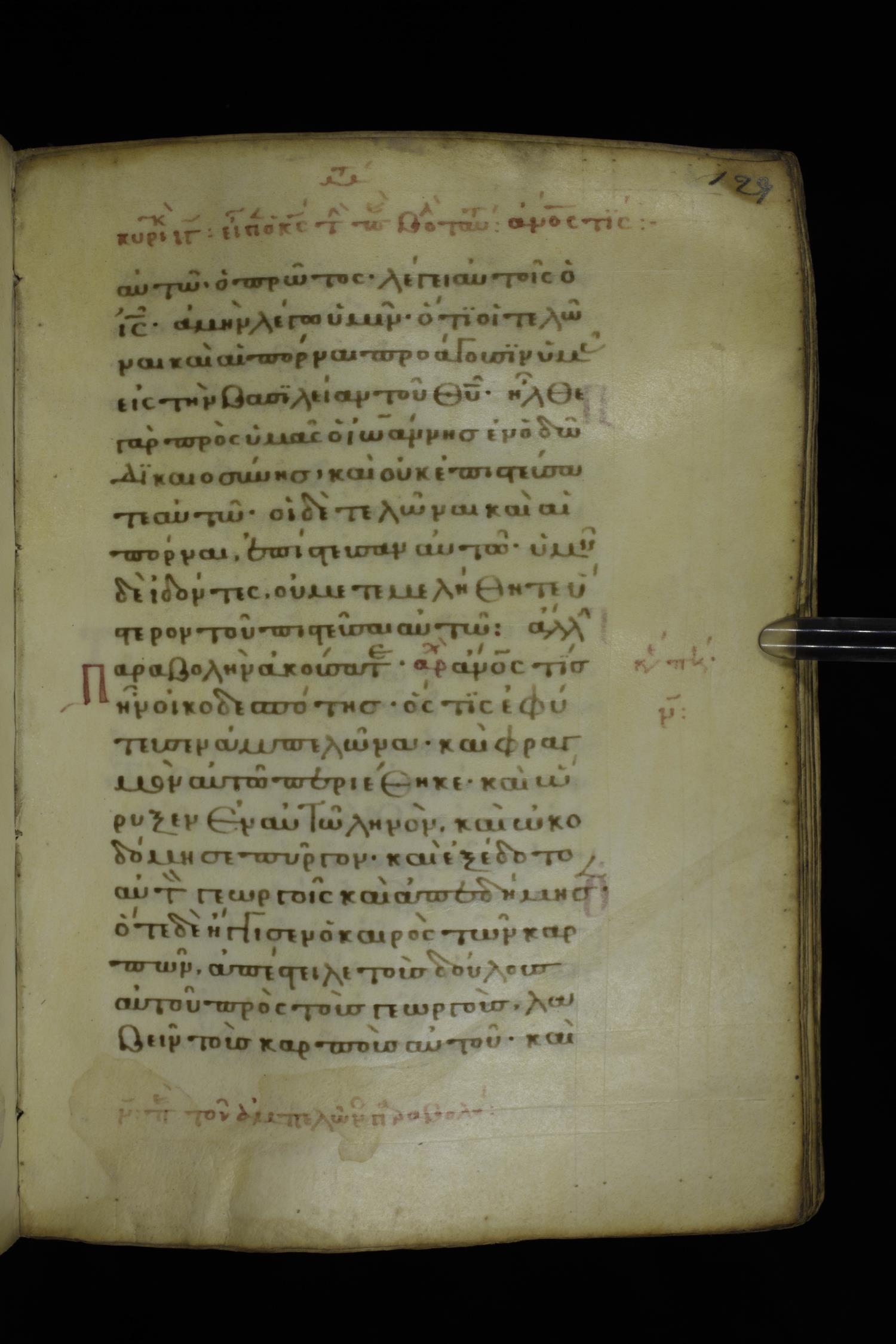 Fourteenth century minuscule of the Gospels on parchment; 332 leaves, 1 column, 21 lines per column. Images were taken at the National Library of Greece in Athens.