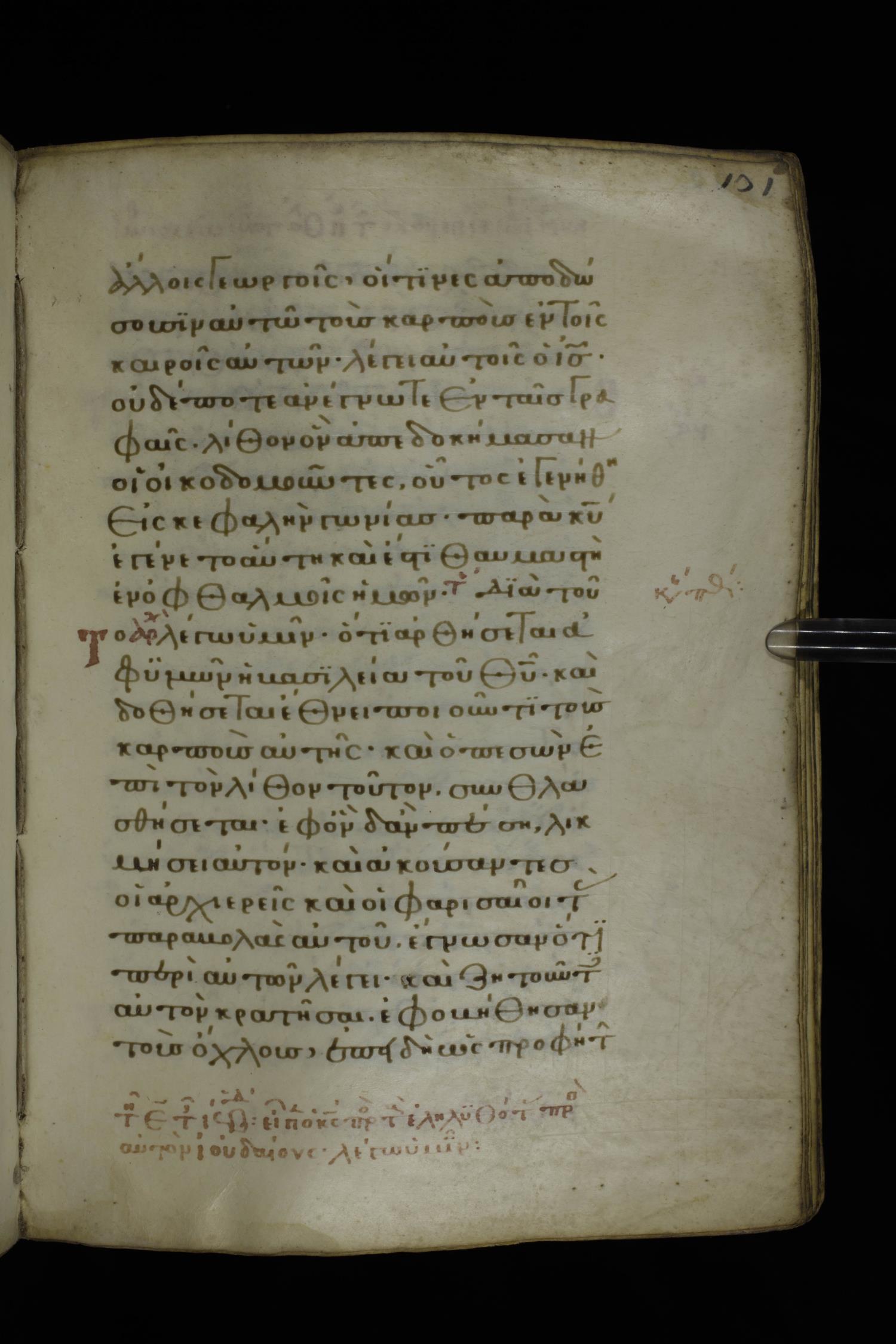 Fourteenth century minuscule of the Gospels on parchment; 332 leaves, 1 column, 21 lines per column. Images were taken at the National Library of Greece in Athens.