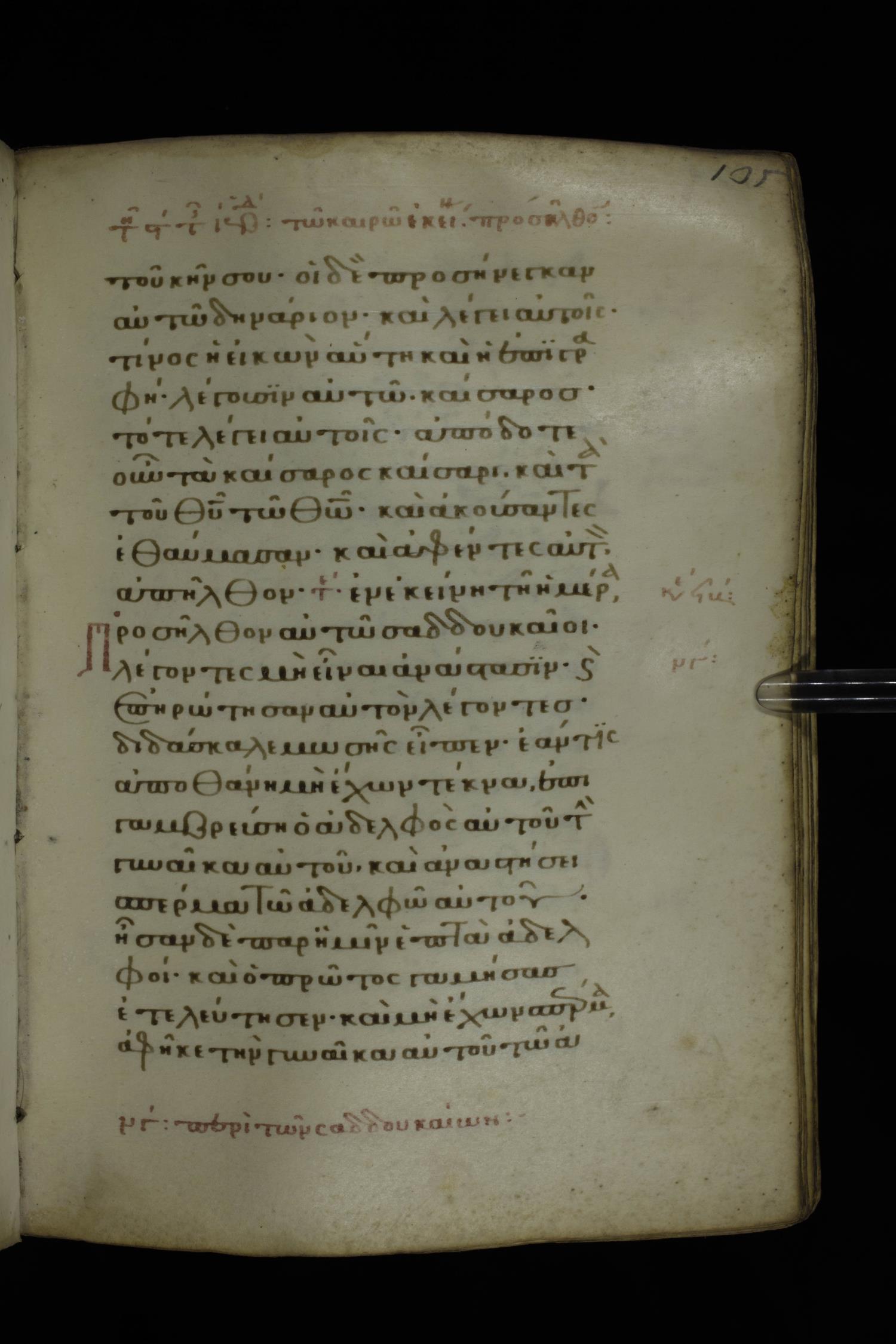 Fourteenth century minuscule of the Gospels on parchment; 332 leaves, 1 column, 21 lines per column. Images were taken at the National Library of Greece in Athens.