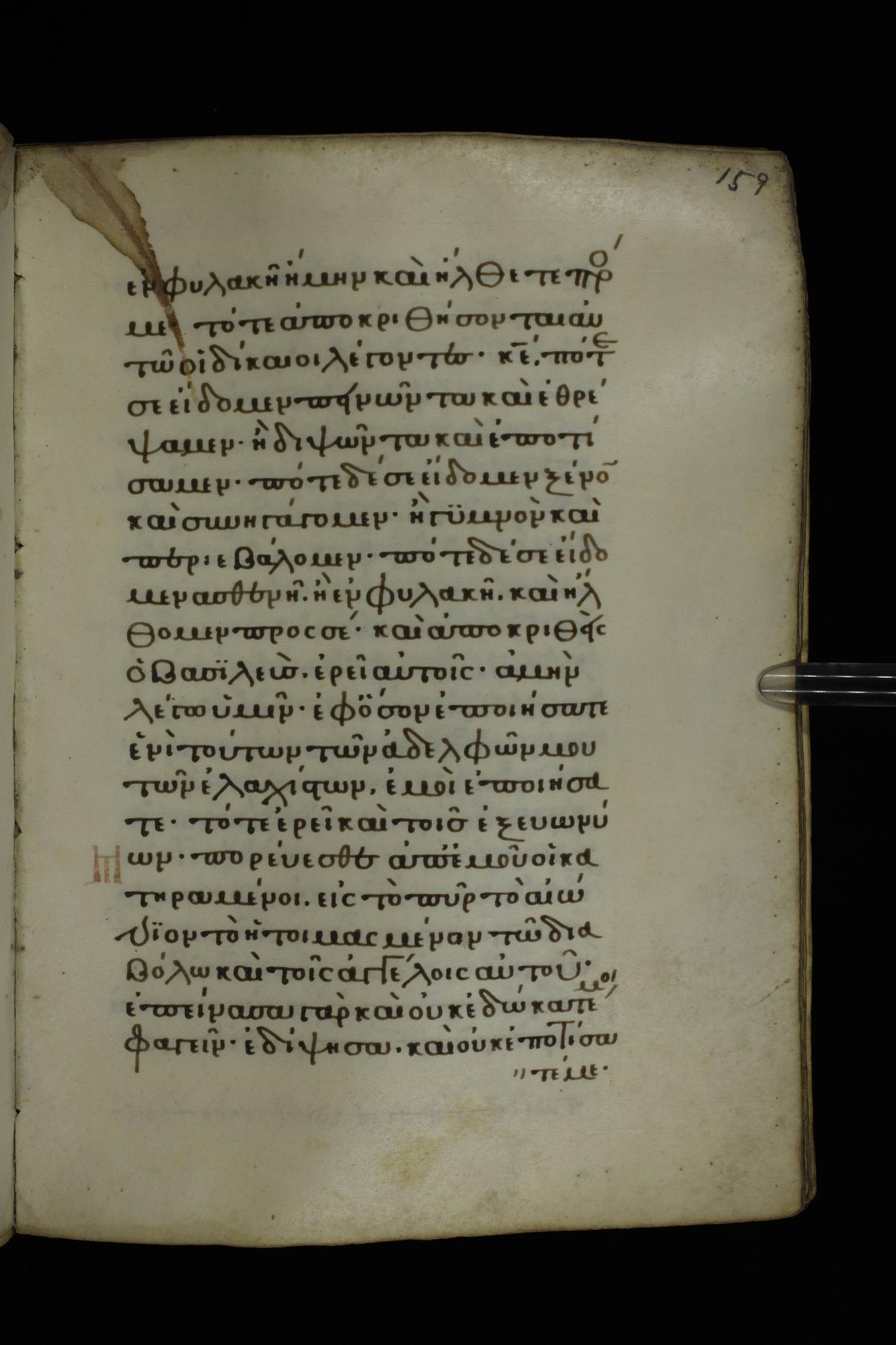 Fourteenth century minuscule of the Gospels on parchment; 332 leaves, 1 column, 21 lines per column. Images were taken at the National Library of Greece in Athens.