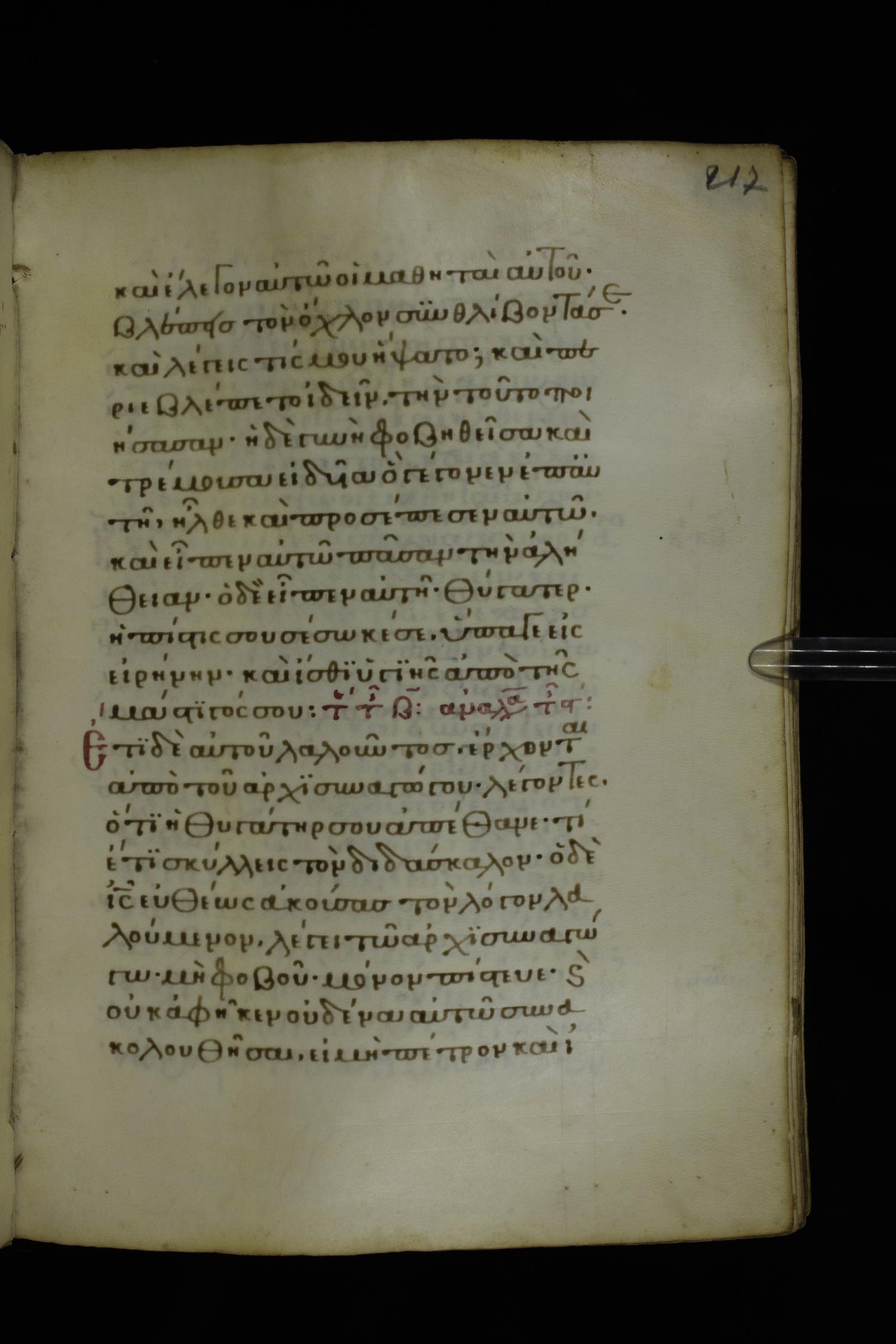 Fourteenth century minuscule of the Gospels on parchment; 332 leaves, 1 column, 21 lines per column. Images were taken at the National Library of Greece in Athens.