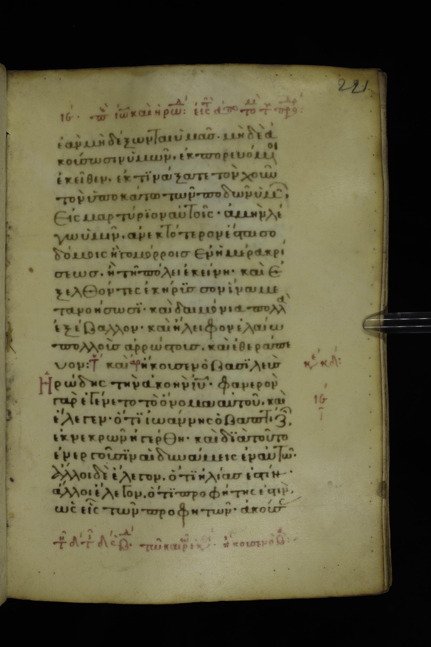 Fourteenth century minuscule of the Gospels on parchment; 332 leaves, 1 column, 21 lines per column. Images were taken at the National Library of Greece in Athens.