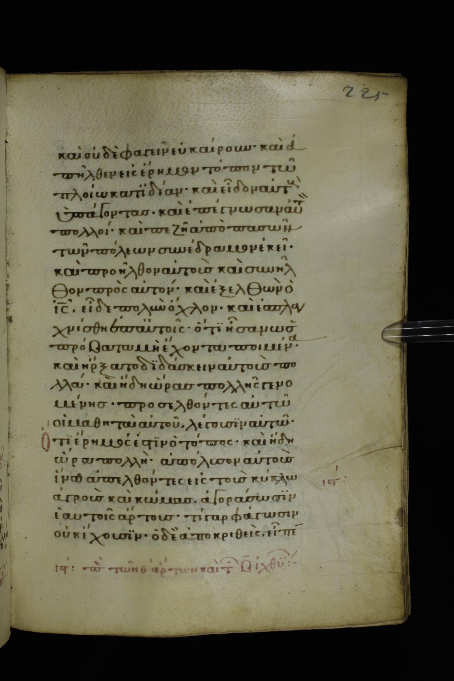 Fourteenth century minuscule of the Gospels on parchment; 332 leaves, 1 column, 21 lines per column. Images were taken at the National Library of Greece in Athens.