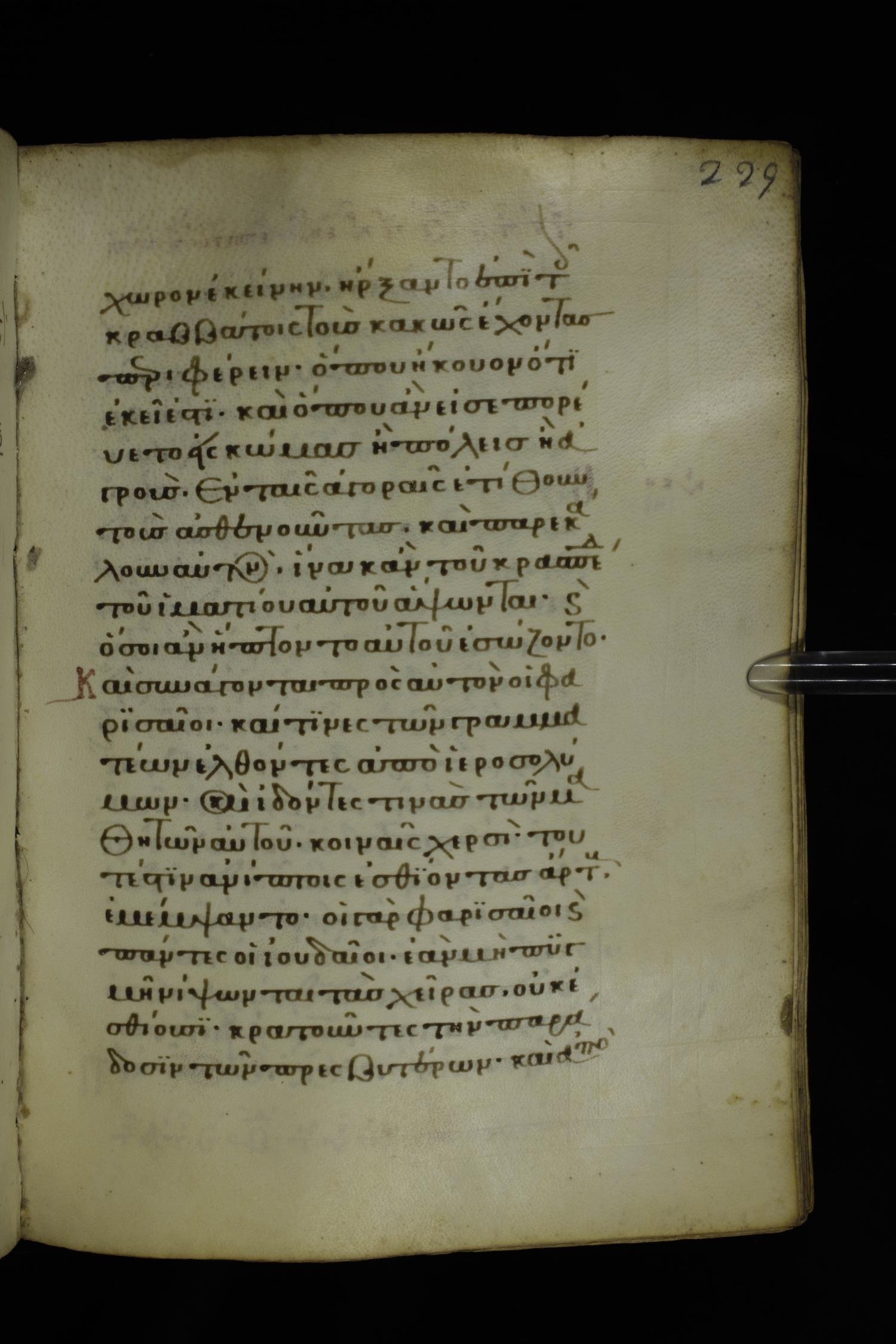 Fourteenth century minuscule of the Gospels on parchment; 332 leaves, 1 column, 21 lines per column. Images were taken at the National Library of Greece in Athens.