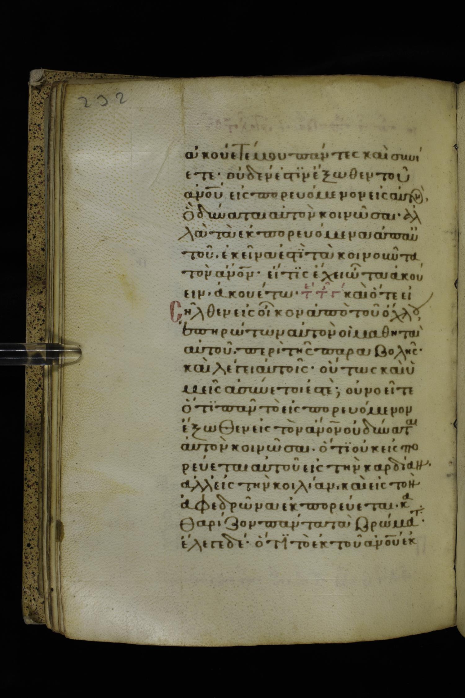 Fourteenth century minuscule of the Gospels on parchment; 332 leaves, 1 column, 21 lines per column. Images were taken at the National Library of Greece in Athens.