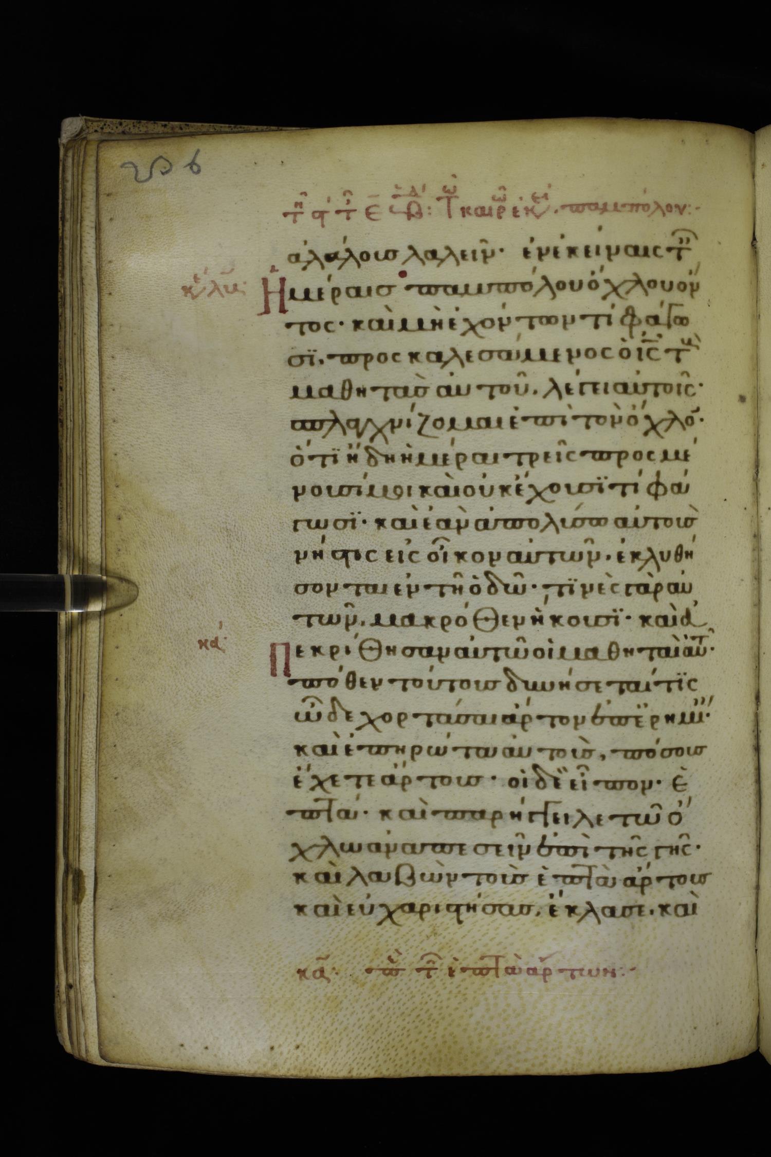 Fourteenth century minuscule of the Gospels on parchment; 332 leaves, 1 column, 21 lines per column. Images were taken at the National Library of Greece in Athens.
