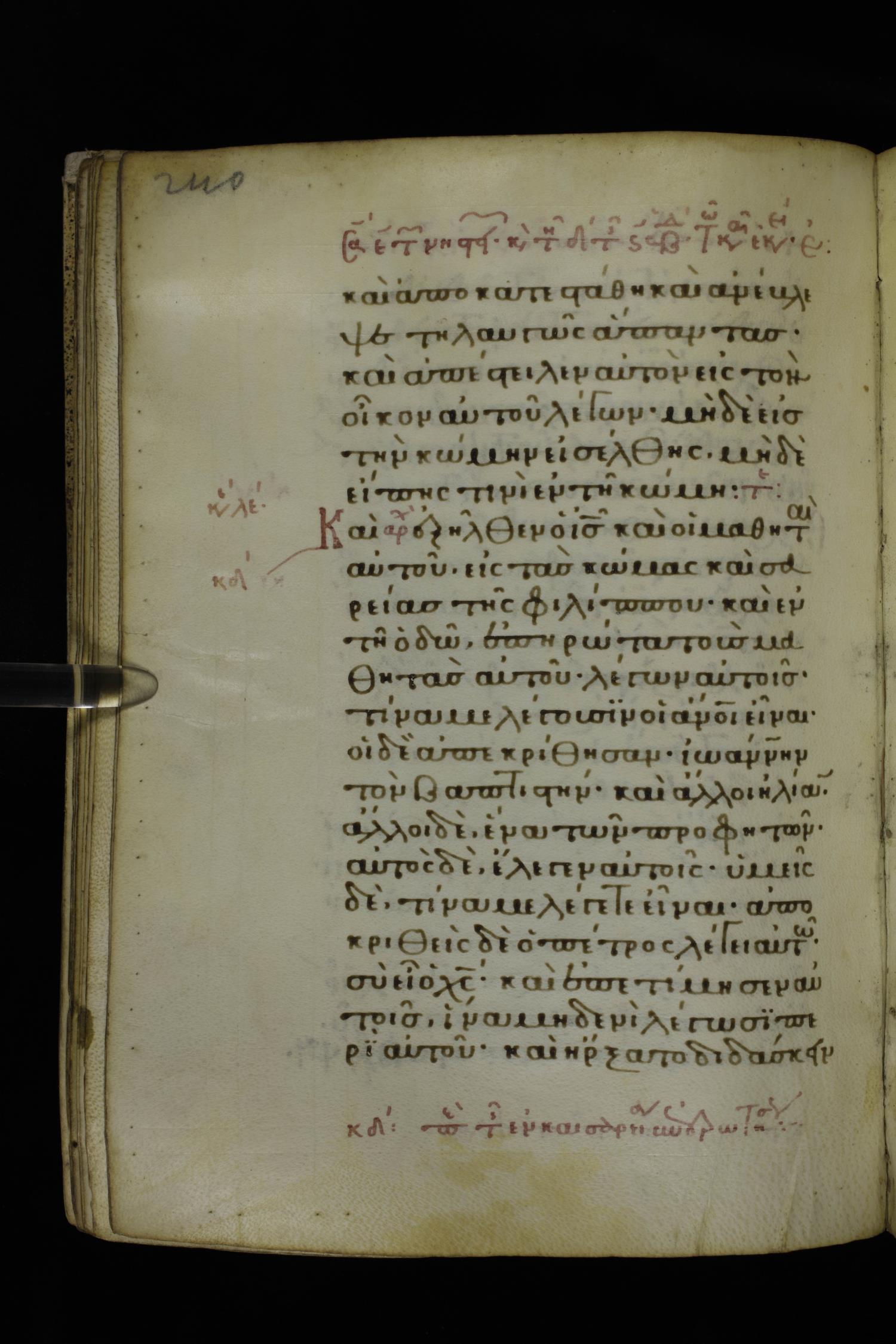 Fourteenth century minuscule of the Gospels on parchment; 332 leaves, 1 column, 21 lines per column. Images were taken at the National Library of Greece in Athens.