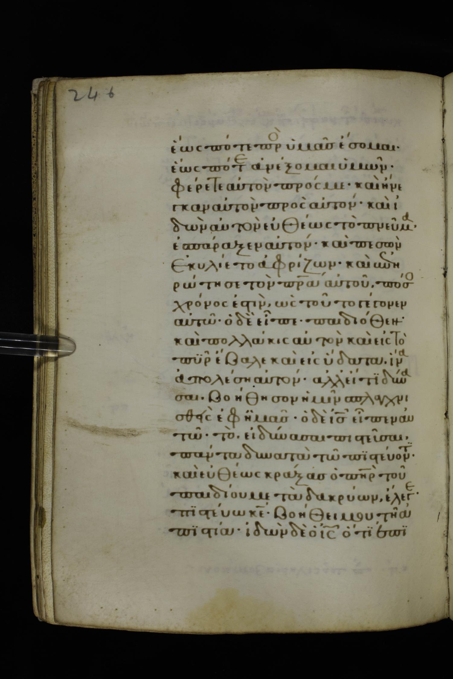 Fourteenth century minuscule of the Gospels on parchment; 332 leaves, 1 column, 21 lines per column. Images were taken at the National Library of Greece in Athens.