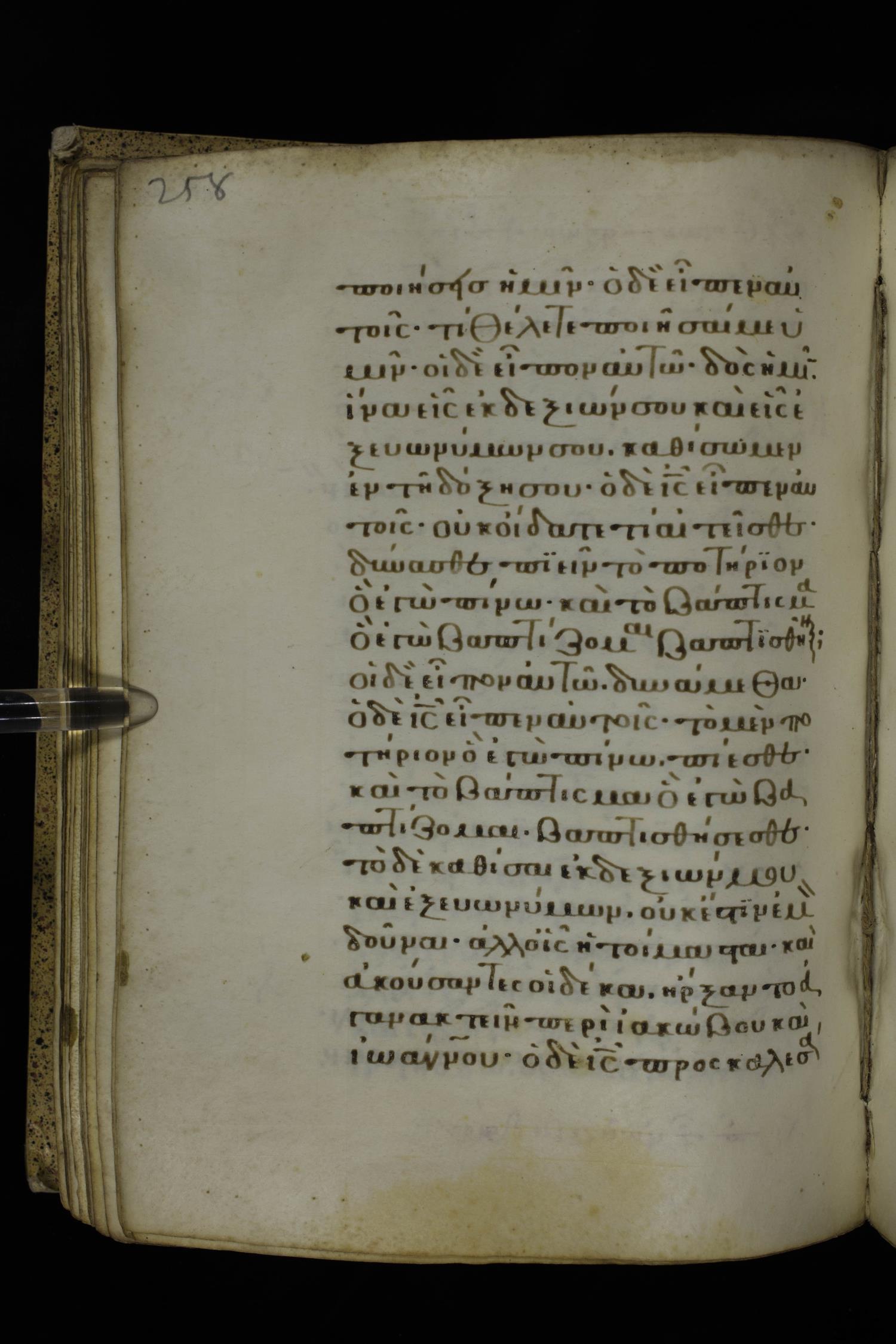 Fourteenth century minuscule of the Gospels on parchment; 332 leaves, 1 column, 21 lines per column. Images were taken at the National Library of Greece in Athens.