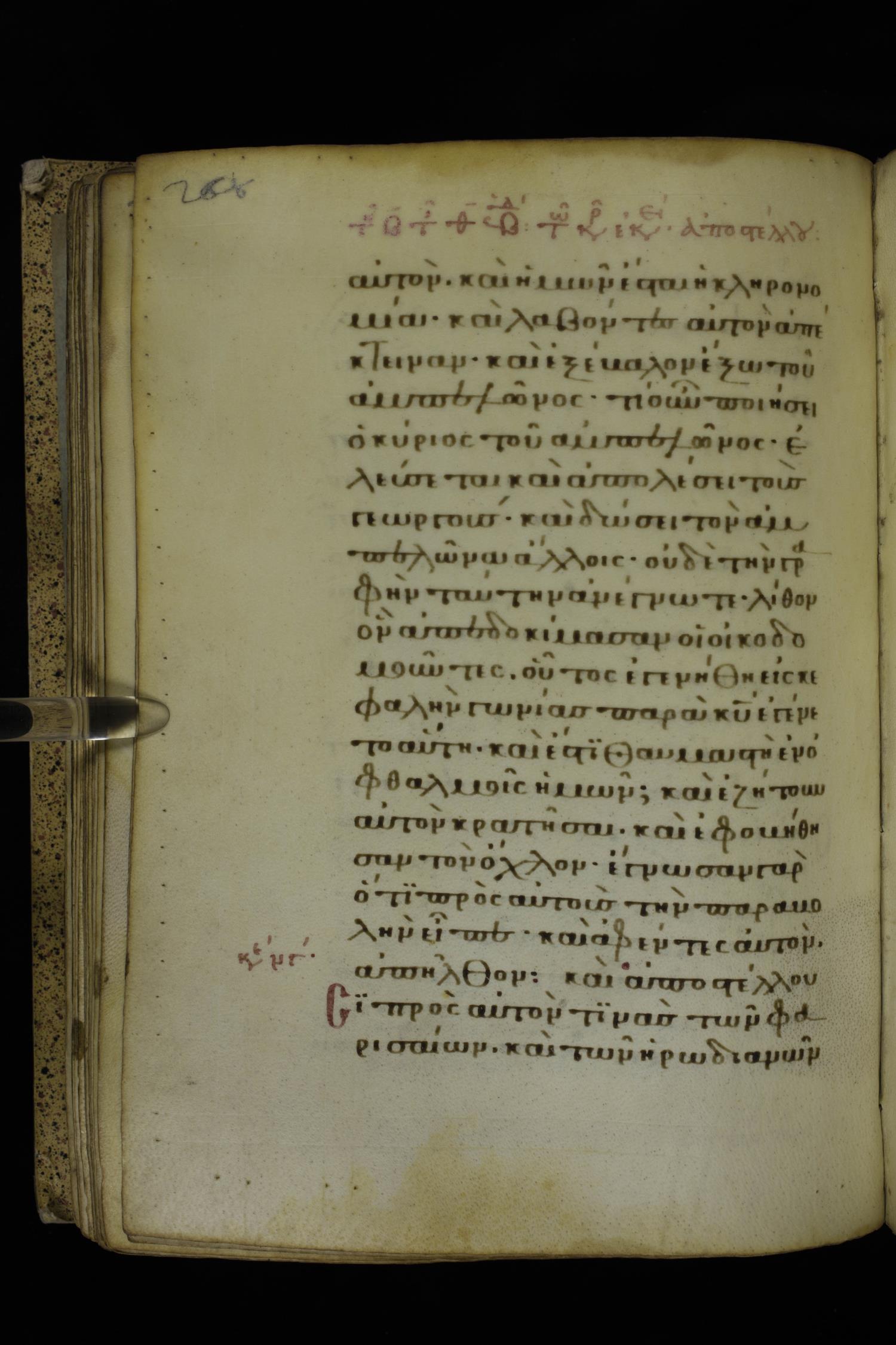 Fourteenth century minuscule of the Gospels on parchment; 332 leaves, 1 column, 21 lines per column. Images were taken at the National Library of Greece in Athens.