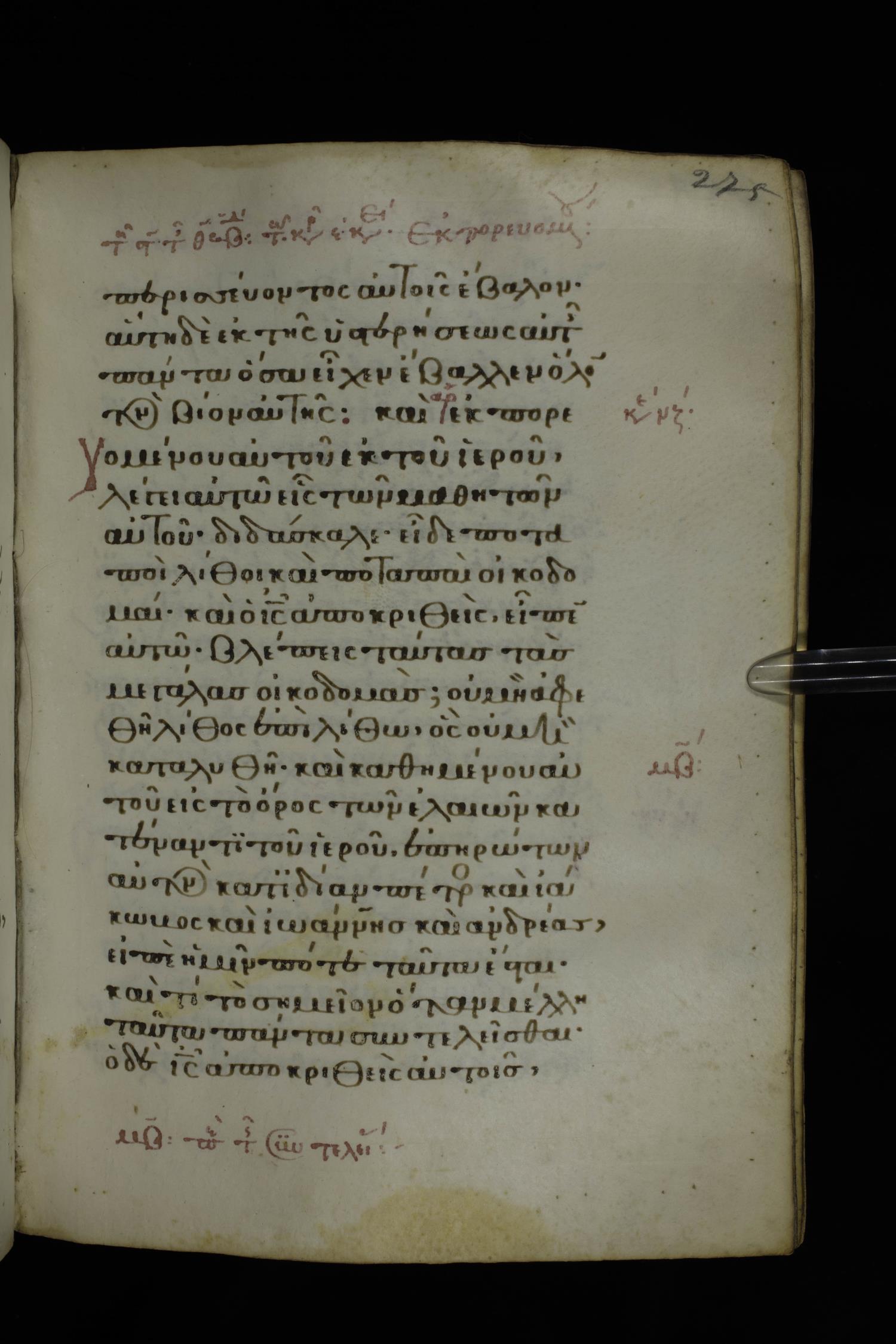 Fourteenth century minuscule of the Gospels on parchment; 332 leaves, 1 column, 21 lines per column. Images were taken at the National Library of Greece in Athens.