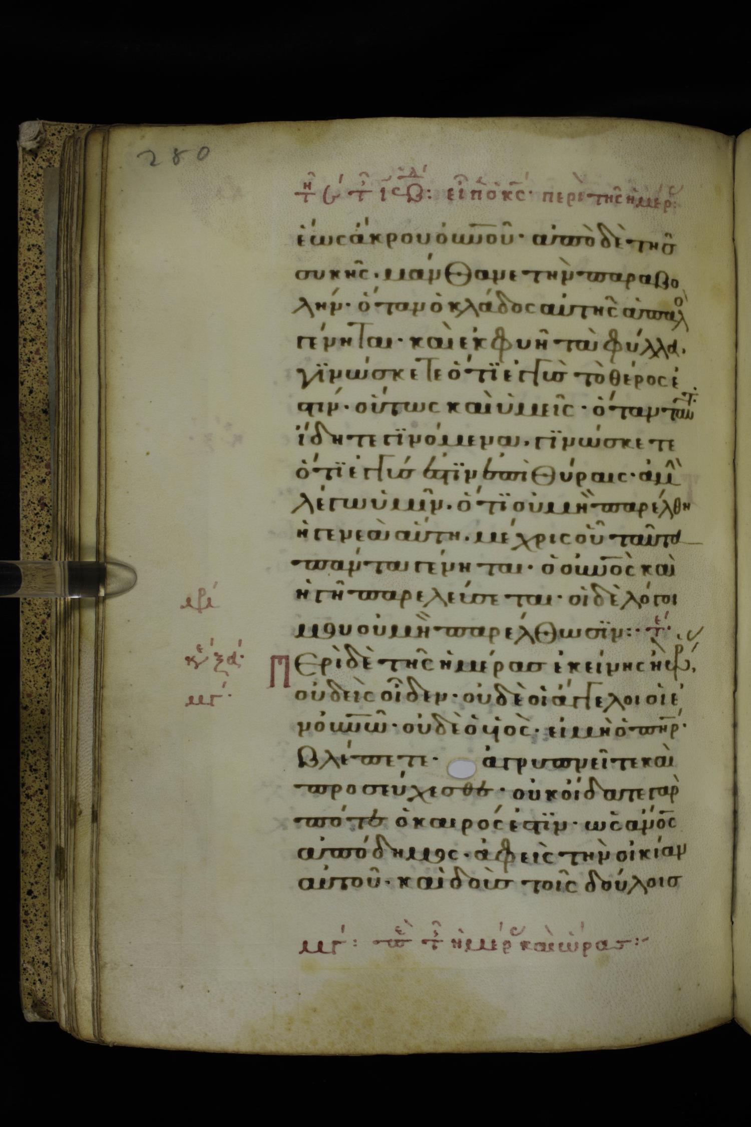 Fourteenth century minuscule of the Gospels on parchment; 332 leaves, 1 column, 21 lines per column. Images were taken at the National Library of Greece in Athens.